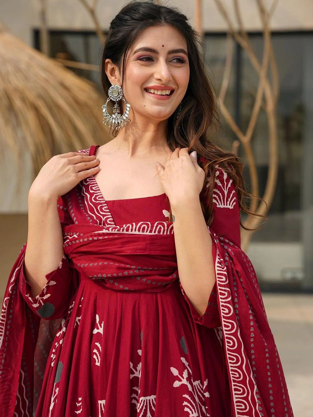 Red and Maroon color Salwar Kameez in Rayon fabric with Printed work
