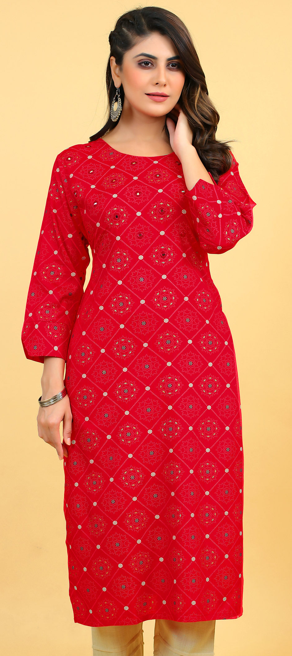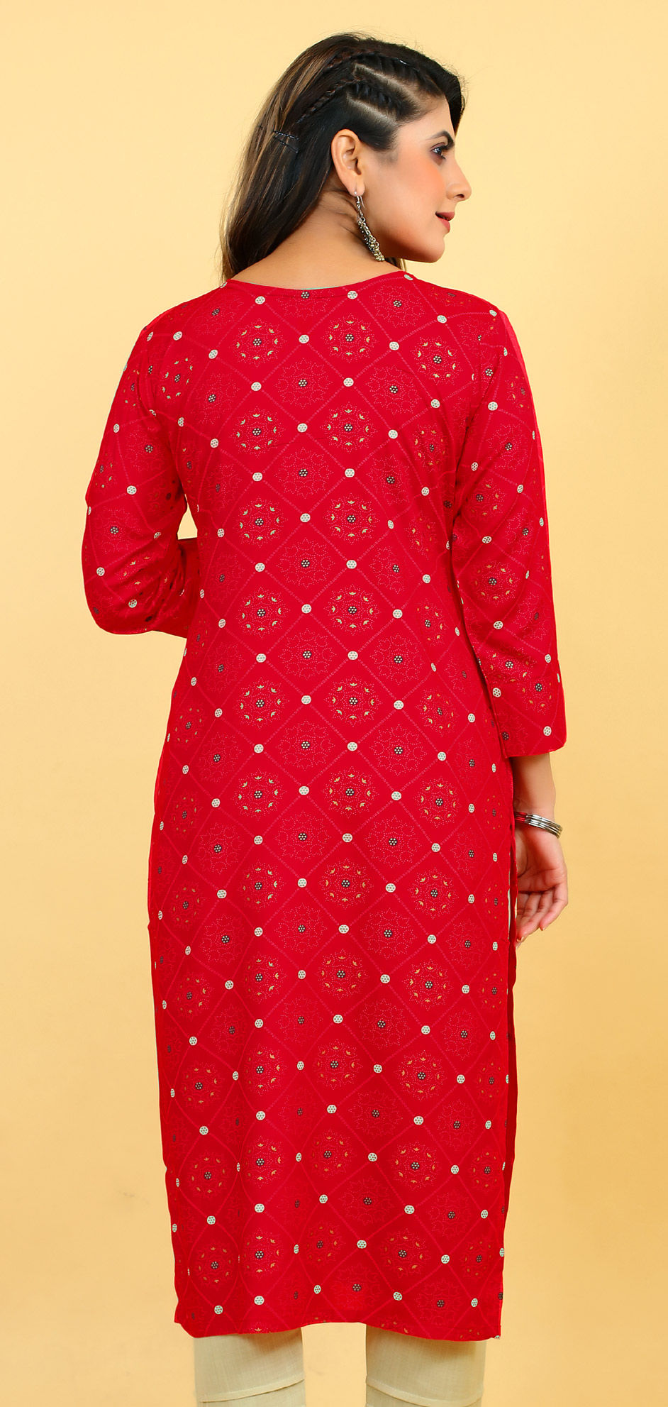 Red and Maroon color Kurti in Rayon fabric with Embroidered, Mirror, Printed work