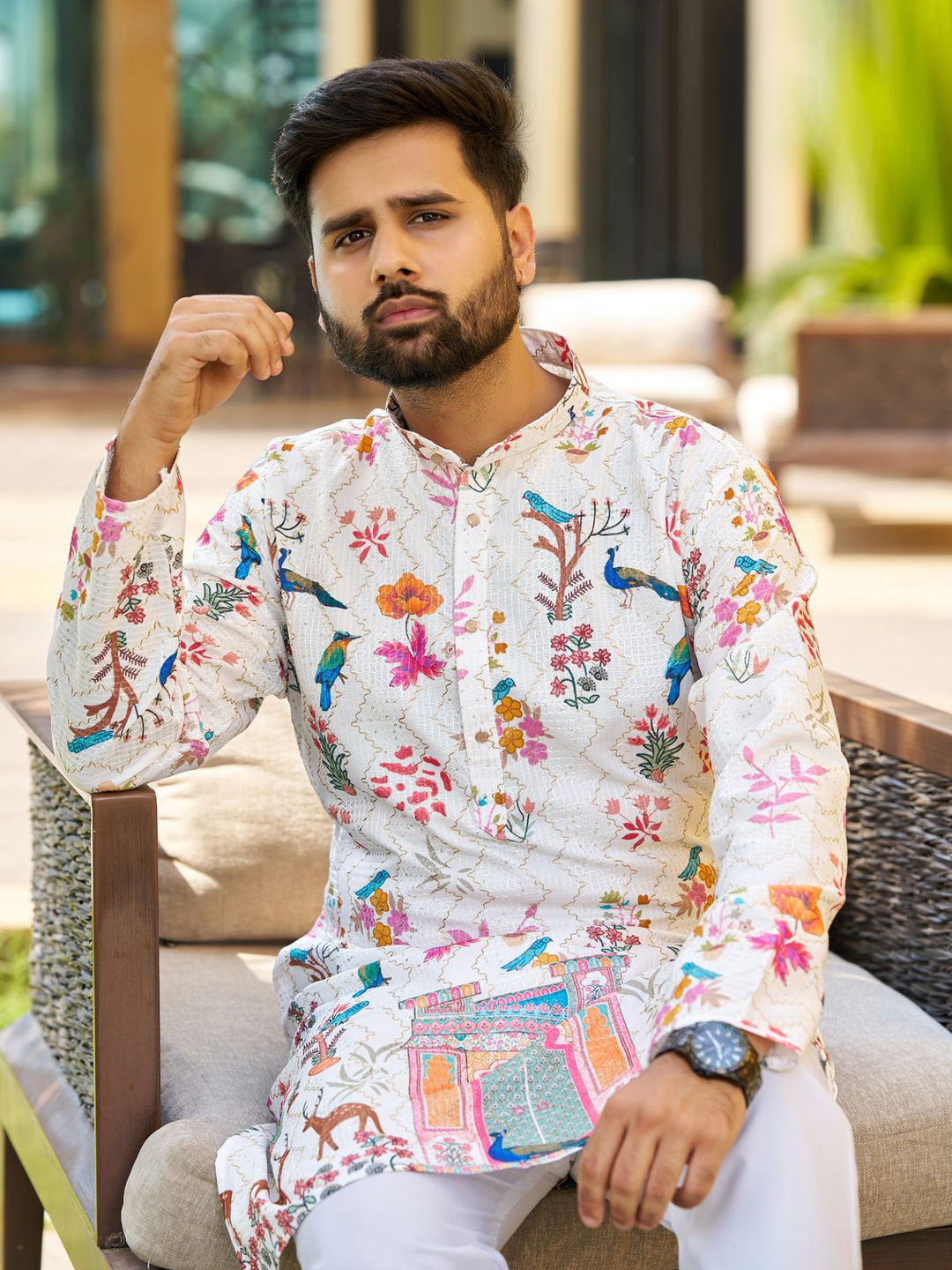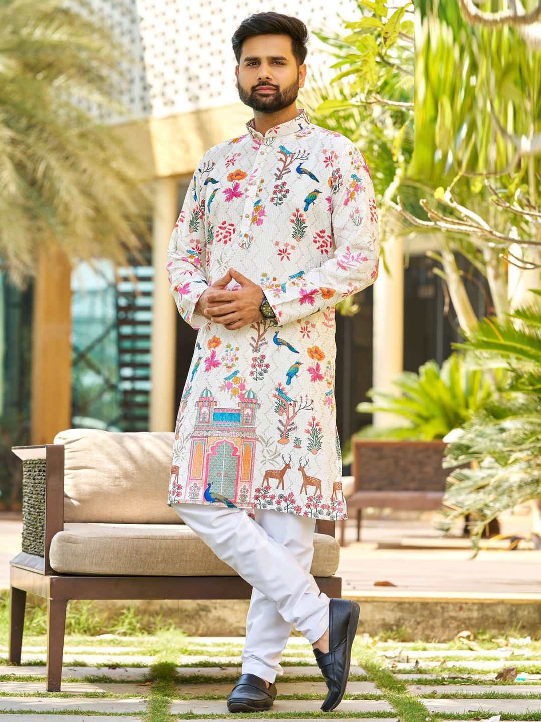 White and Off White color Kurta Pyjamas in Rayon fabric with Embroidered, Floral, Printed, Thread work