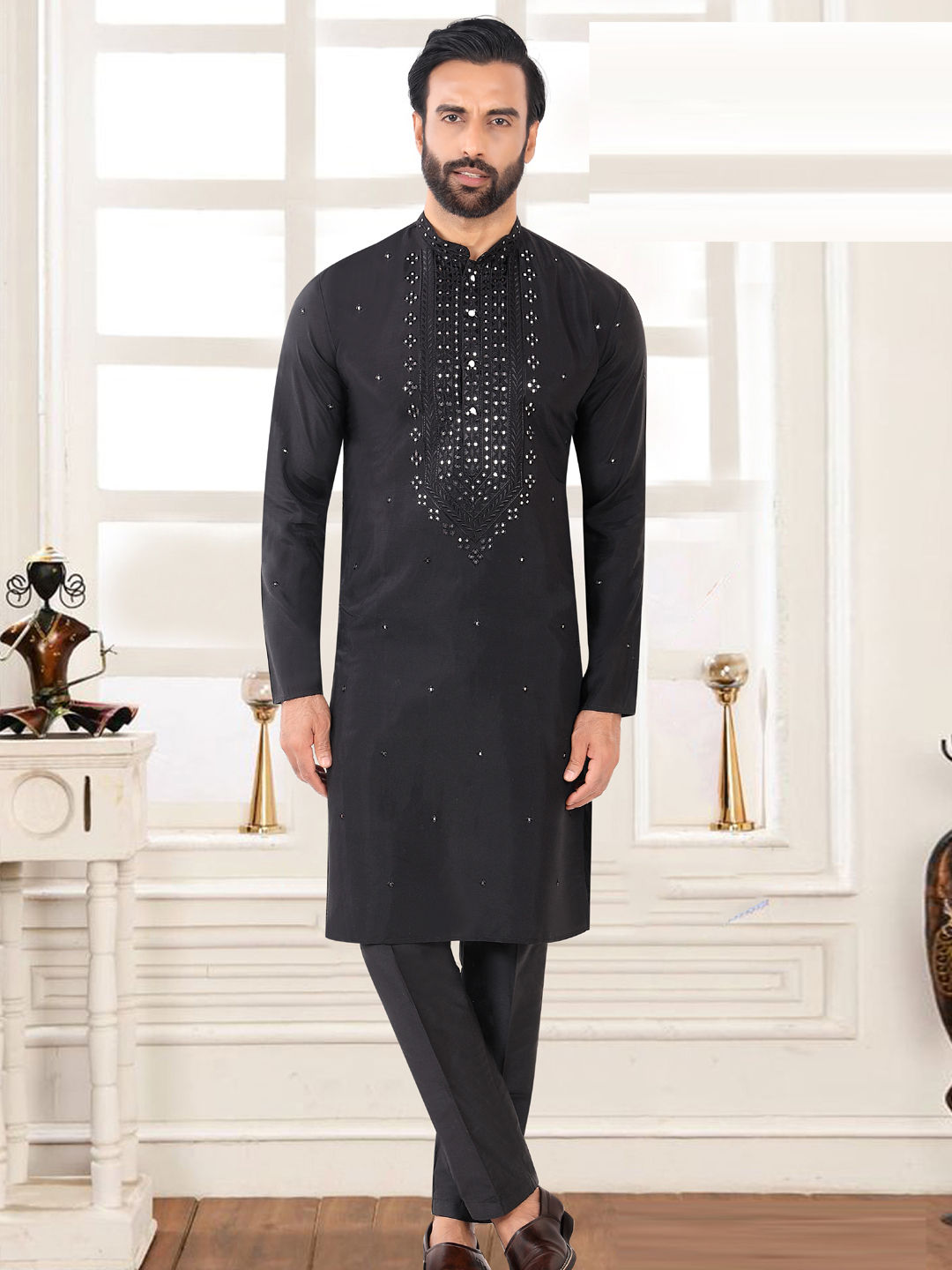 Jacquard Party Wear Kurta Pyjamas in Black and Grey with Embroidered work