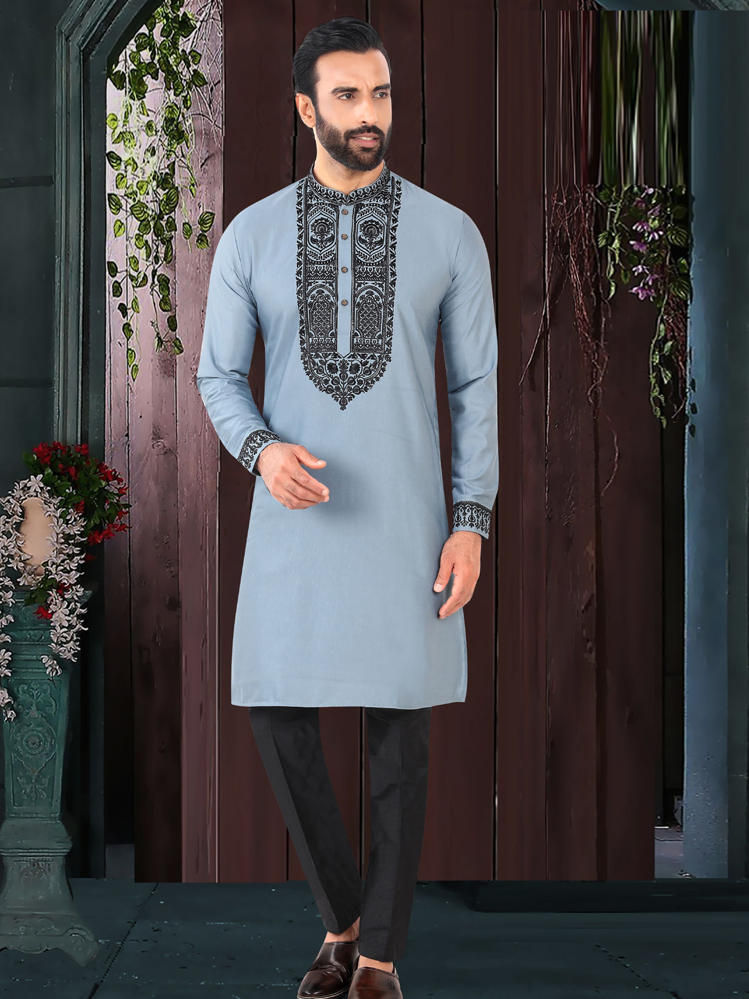 Jacquard Party Wear Kurta Pyjamas in Black and Grey with Embroidered work