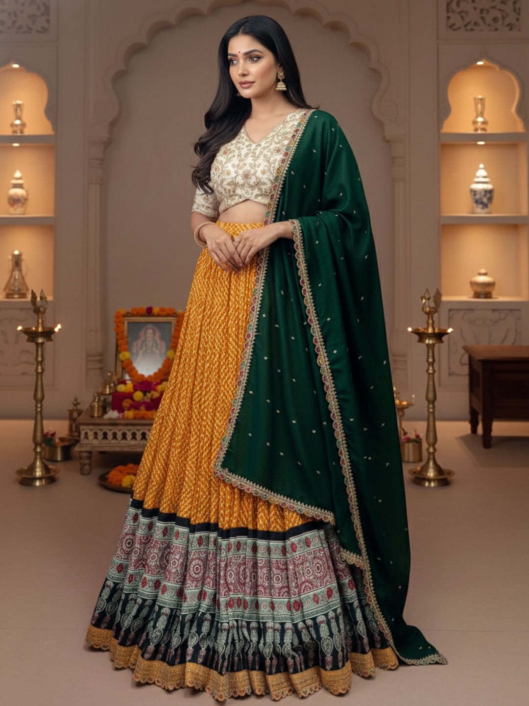 Black and Grey, Yellow color Lehenga in Rayon fabric with Bandhej, Embroidered, Lace, Sequence, Thread work