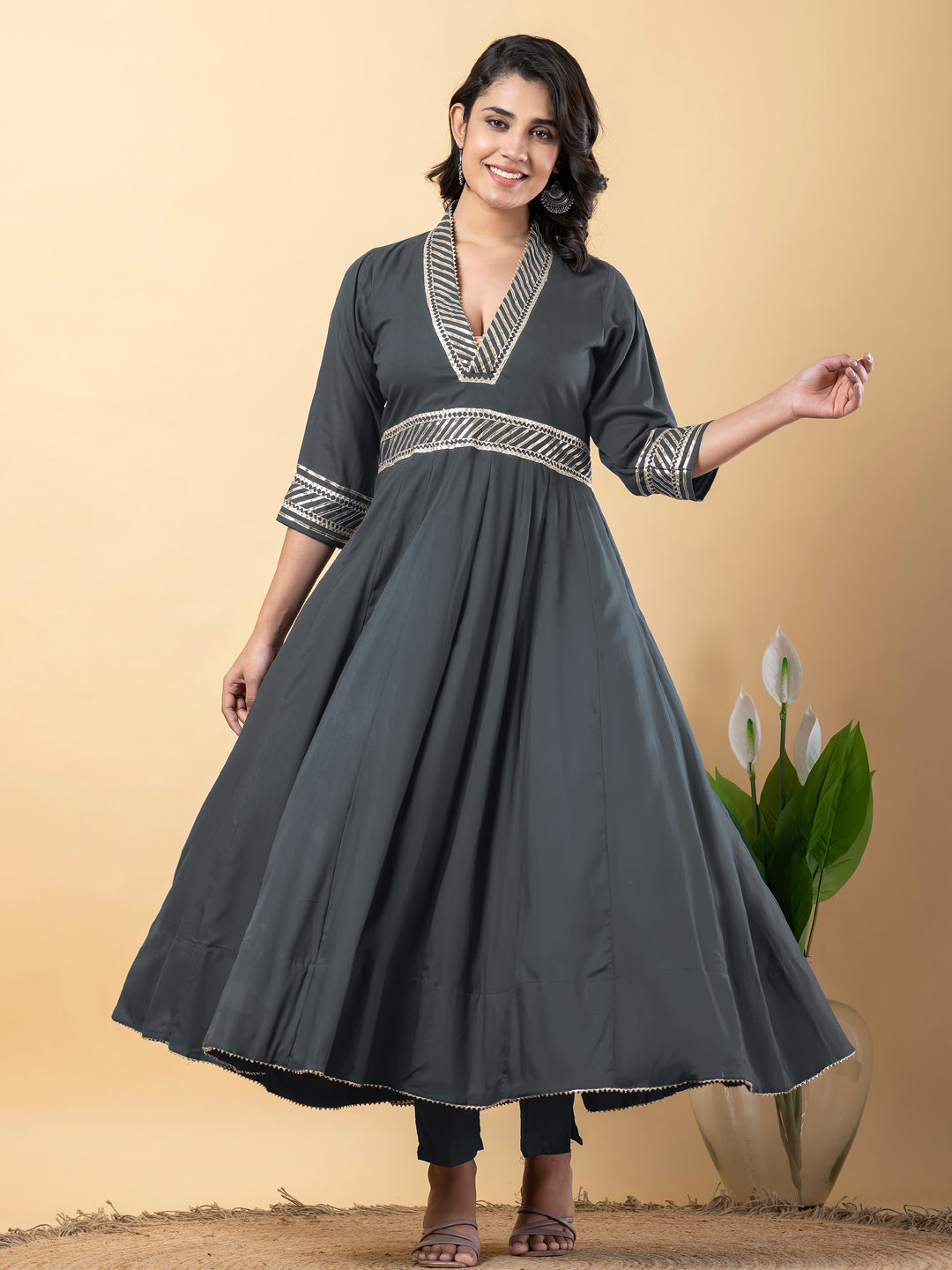 Black and Grey color Salwar Kameez in Rayon fabric with Gota Patti work