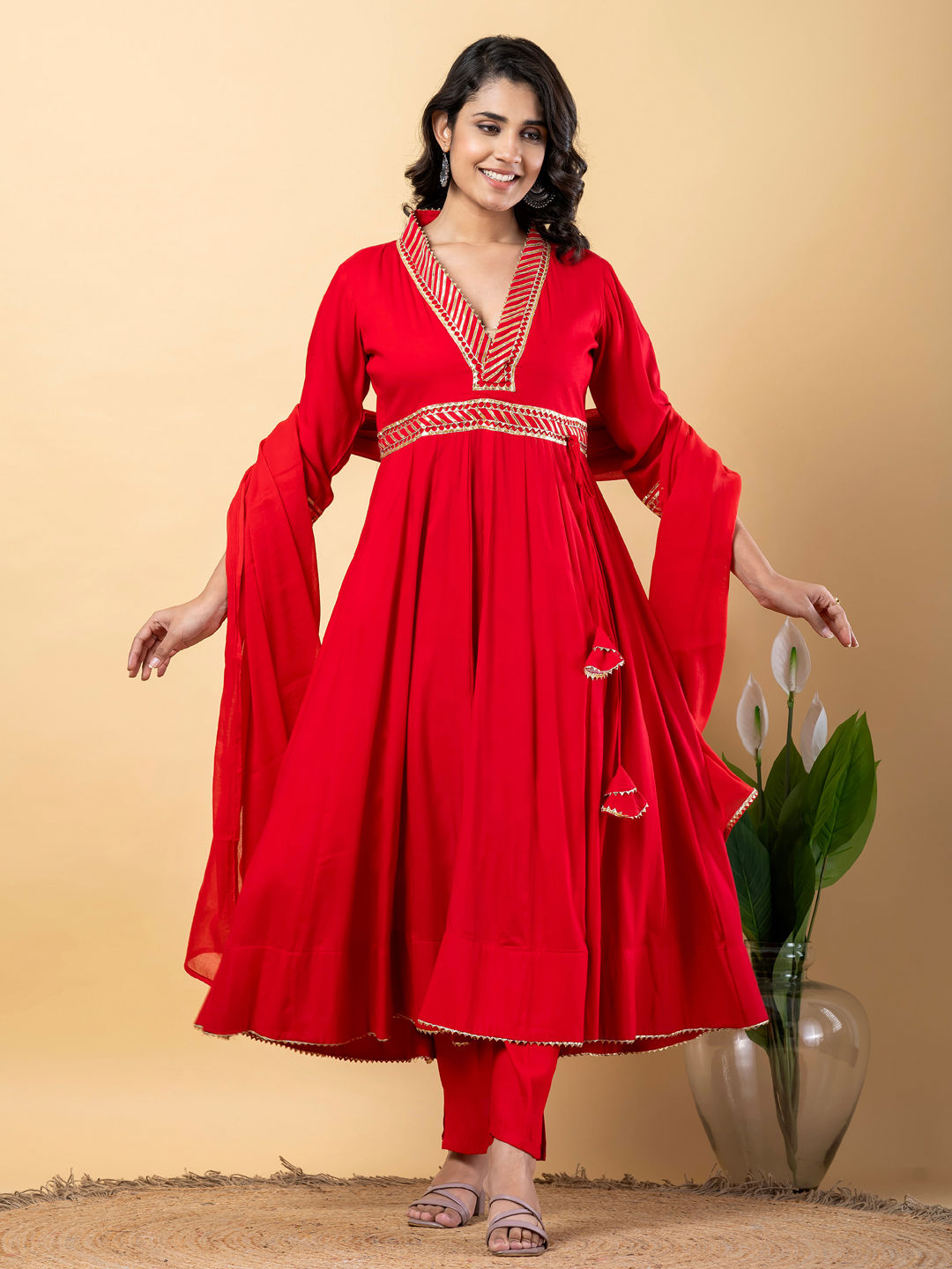 Rayon Party Wear Salwar Kameez in Red and Maroon with Gota Patti work