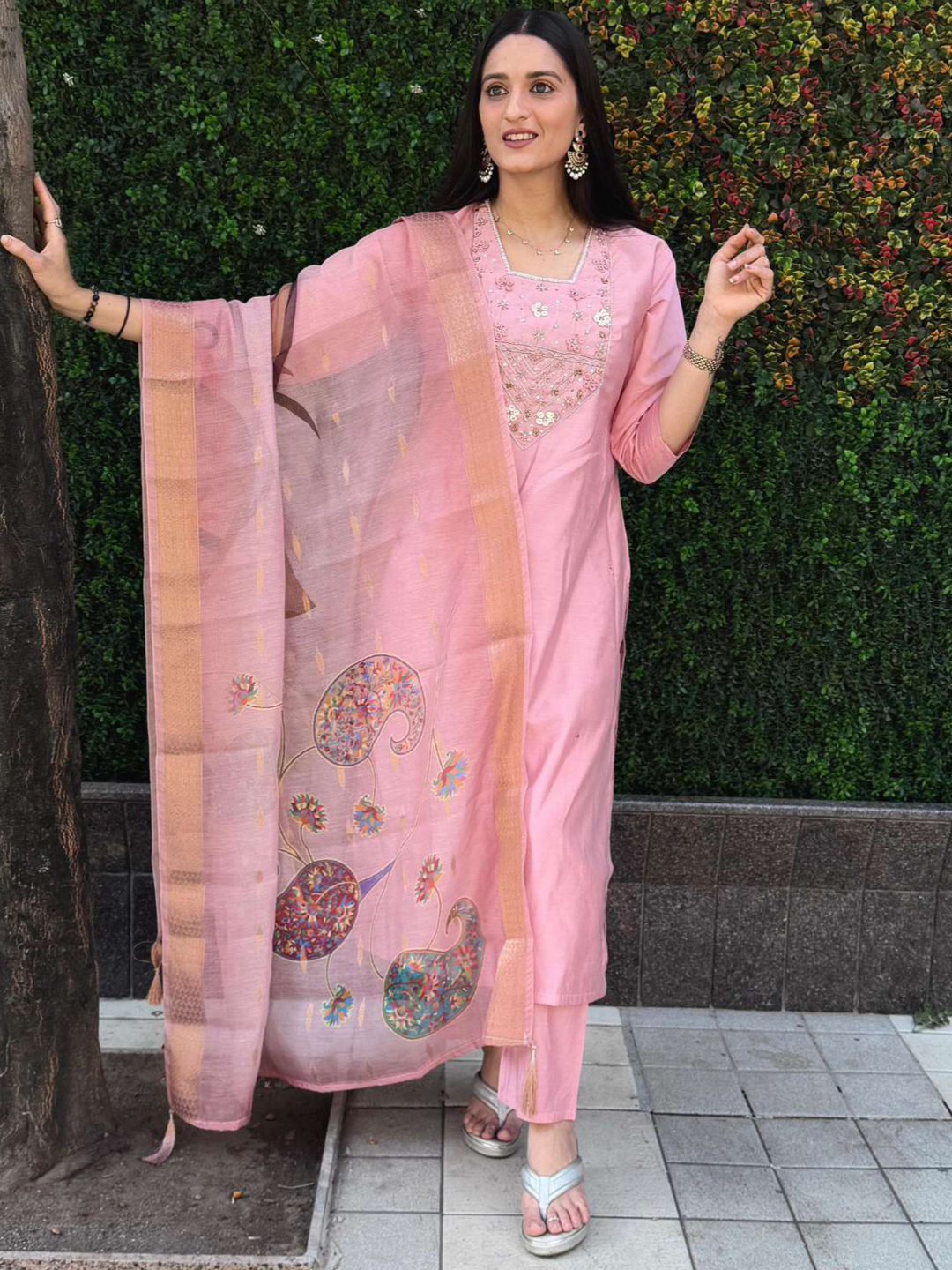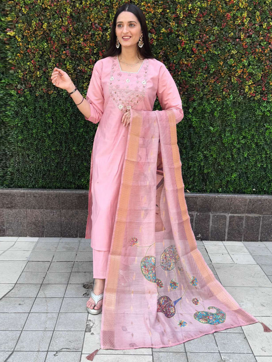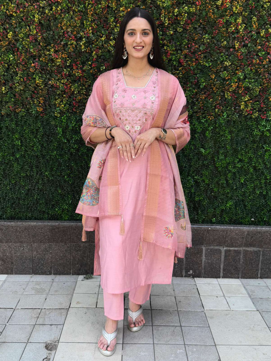 Pink and Majenta color Salwar Kameez in Roman fabric with Sequence, Thread work
