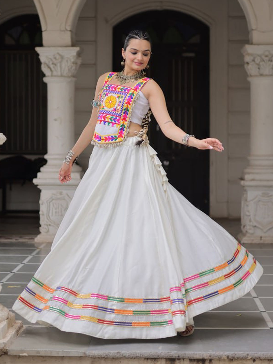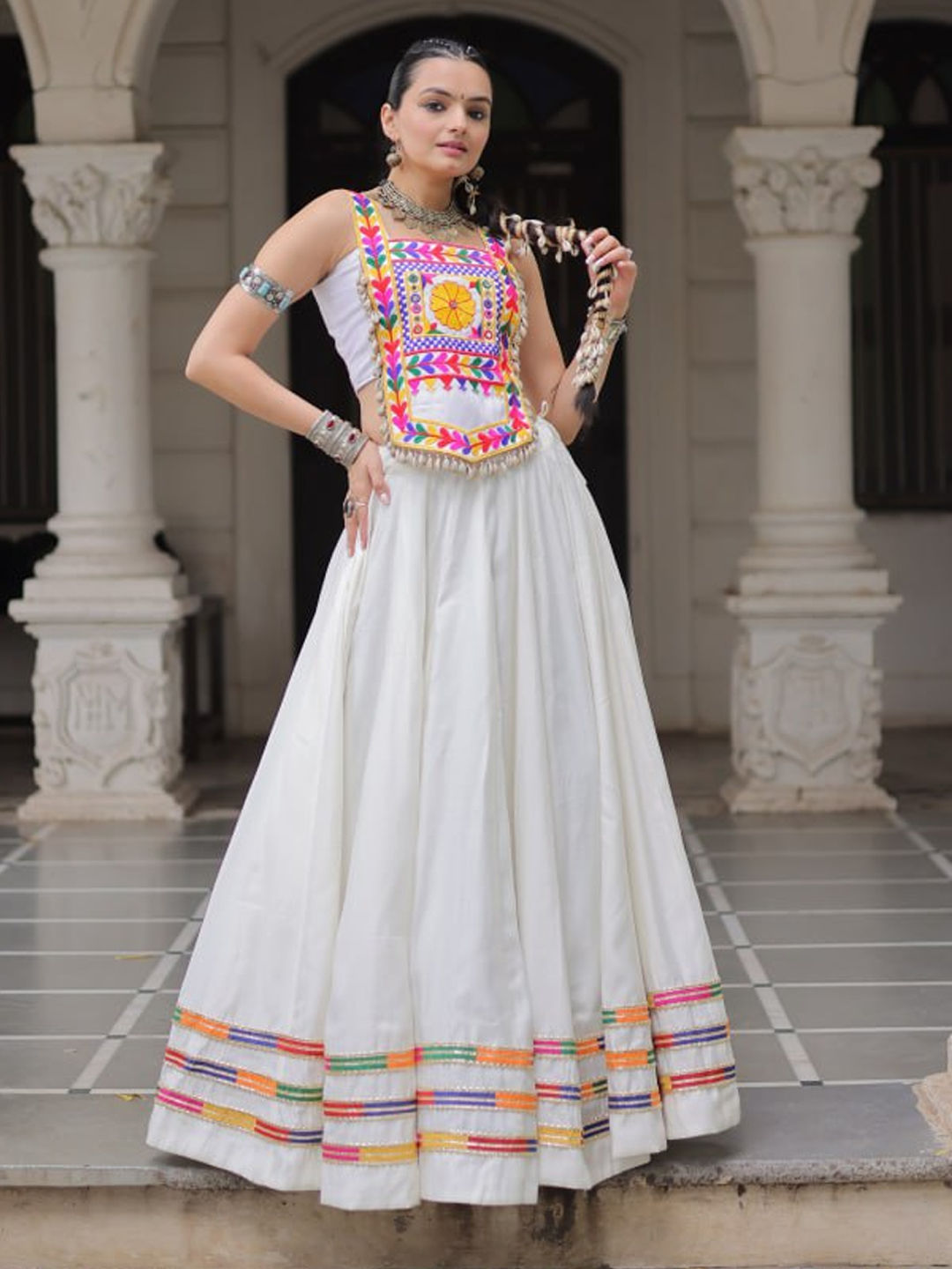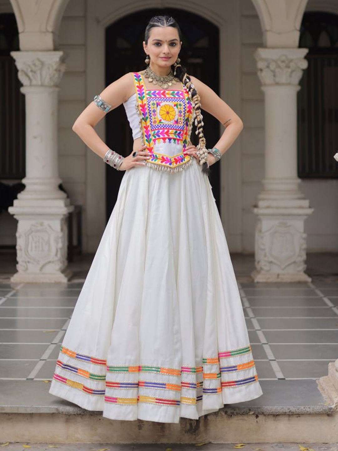 Roman Silk Navratri Ready to Wear Lehenga in White and Off White with Resham work