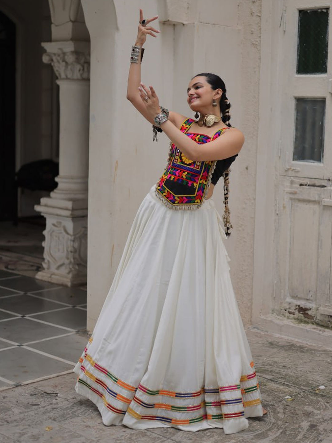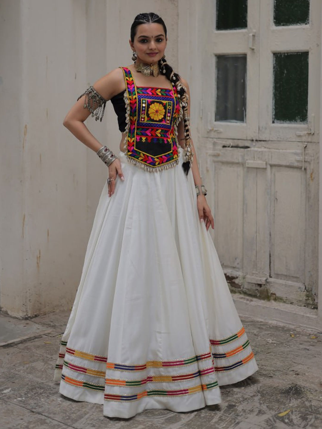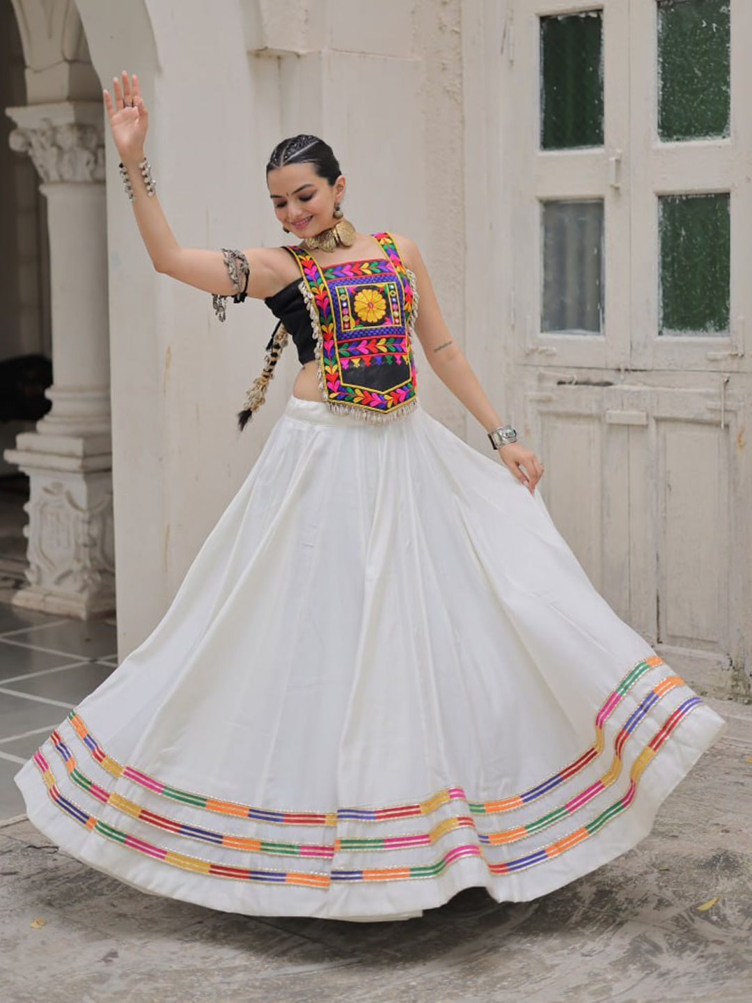 Roman Silk Navratri Ready to Wear Lehenga in White and Off White with Mirror work