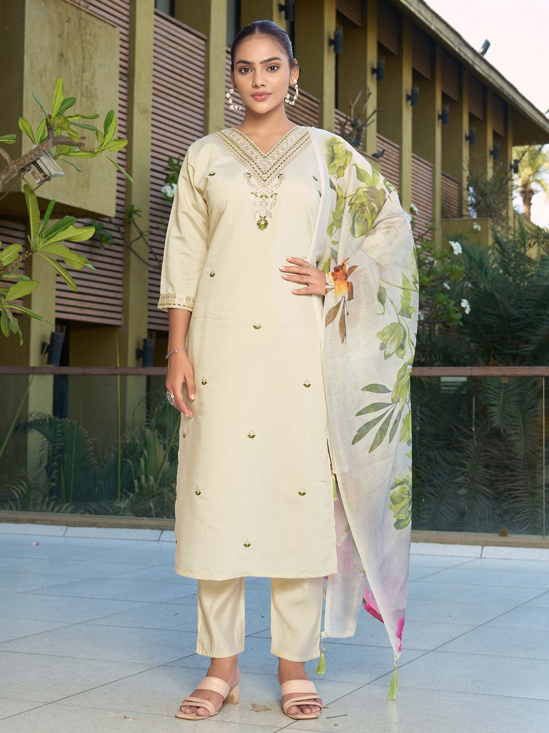 Beige and Brown color Salwar Kameez in Roman Silk fabric with Embroidered work