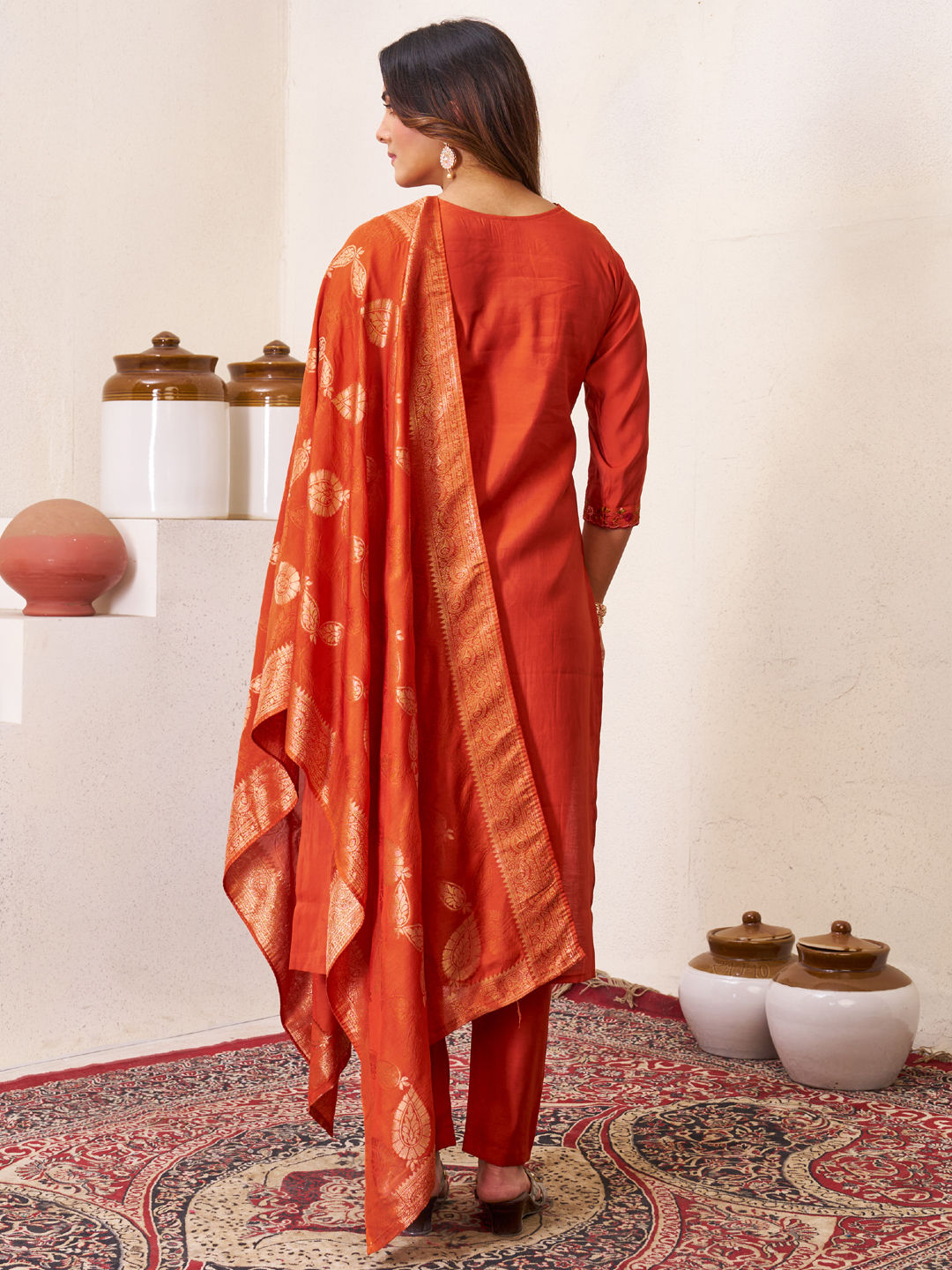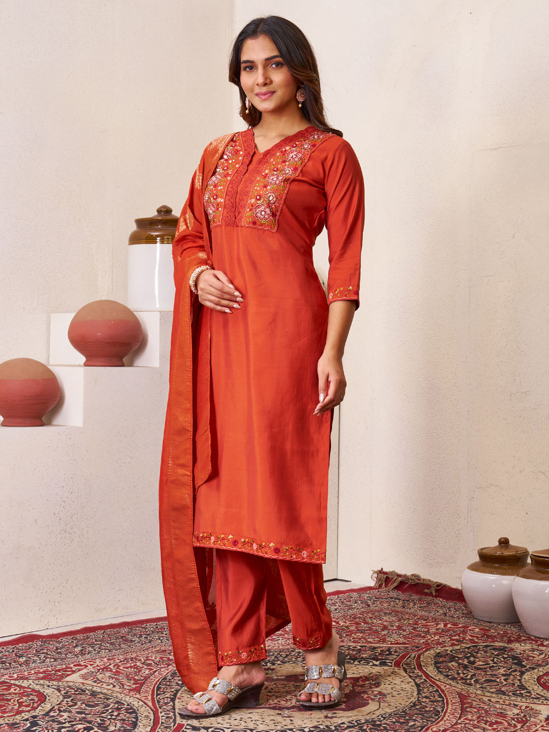 Roman Silk Festive Salwar Kameez in Orange with Embroidered work