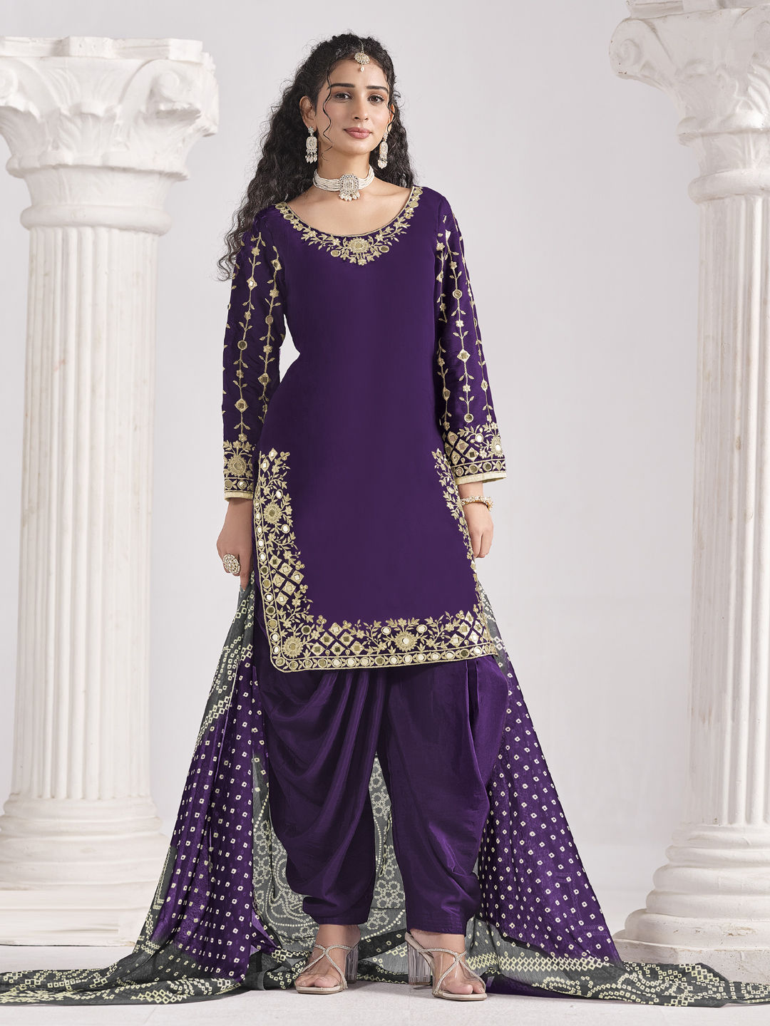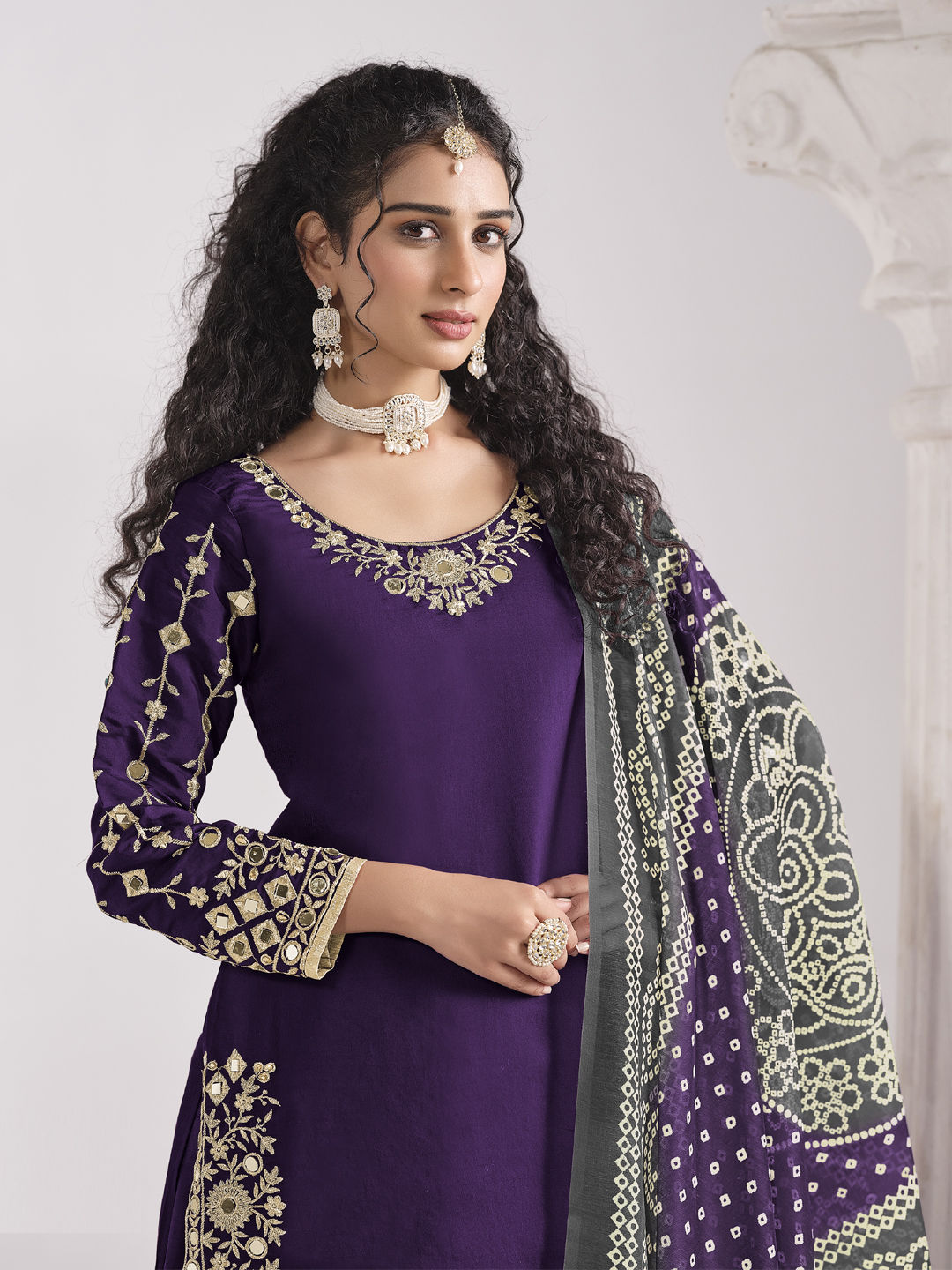 Purple and Violet color Salwar Kameez in Roman Silk fabric with Bandhej, Embroidered, Mirror, Thread, Zari work