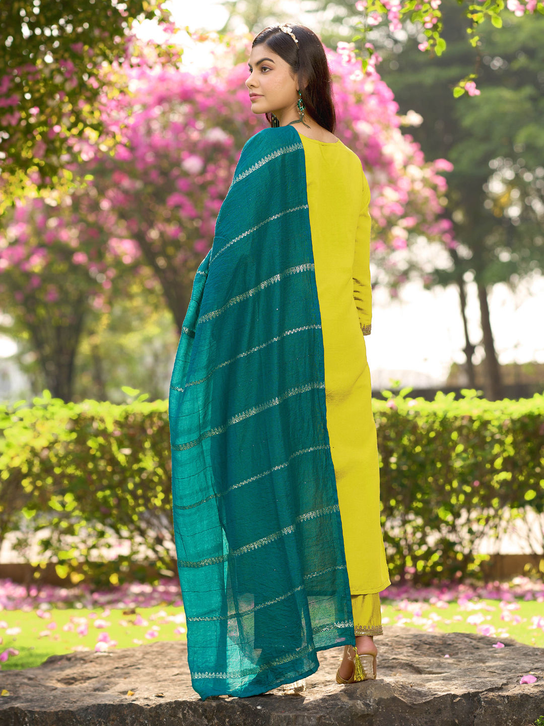 Yellow color Salwar Kameez in Roman Silk fabric with Embroidered work