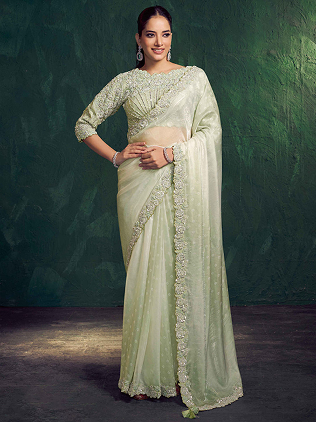 Tissue Mehendi Sangeet Readymade Saree in Green with Border work