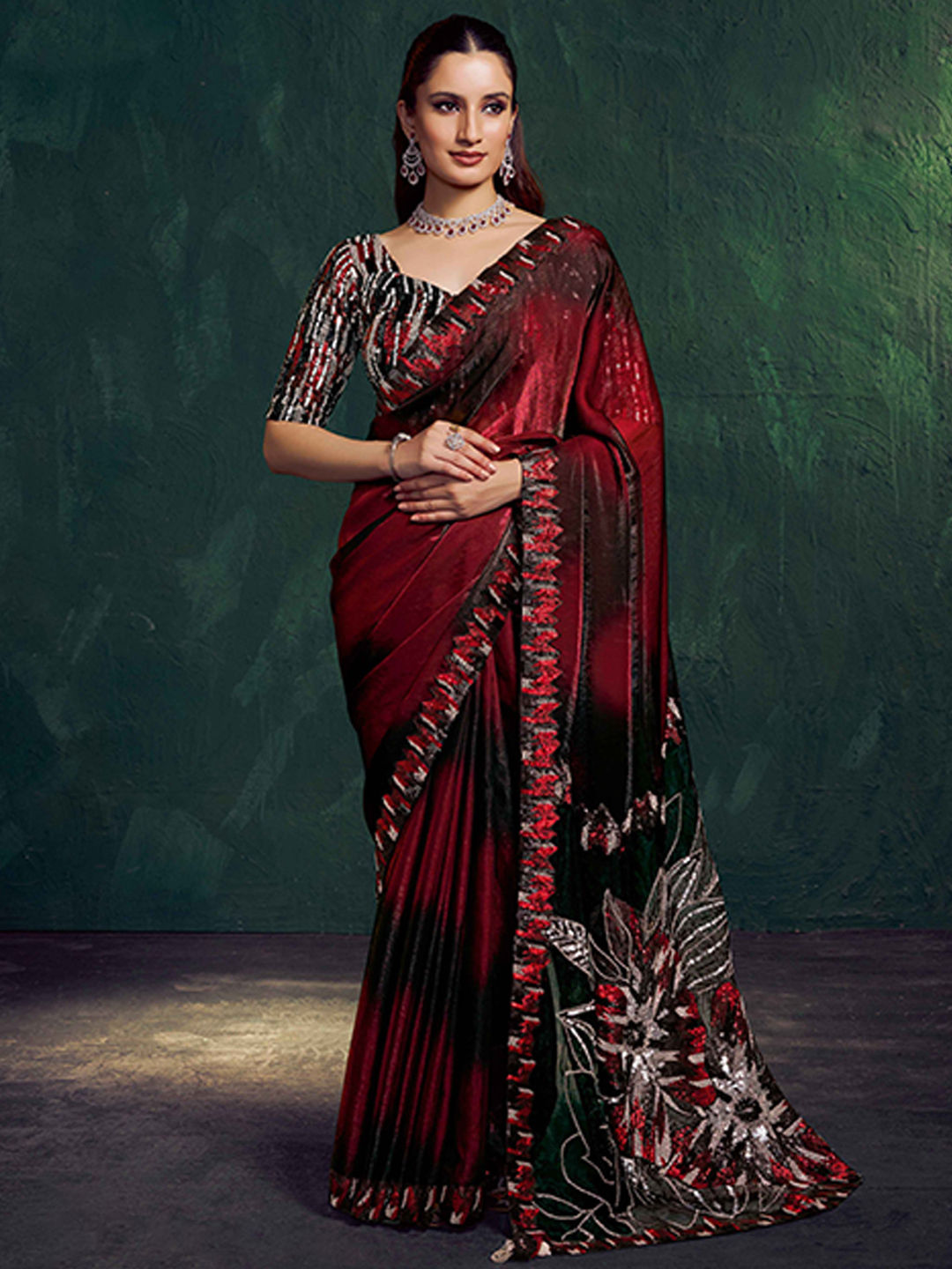 Black and Grey, Red and Maroon color Readymade Saree in Satin fabric with Border, Embroidered, Sequence, Thread work