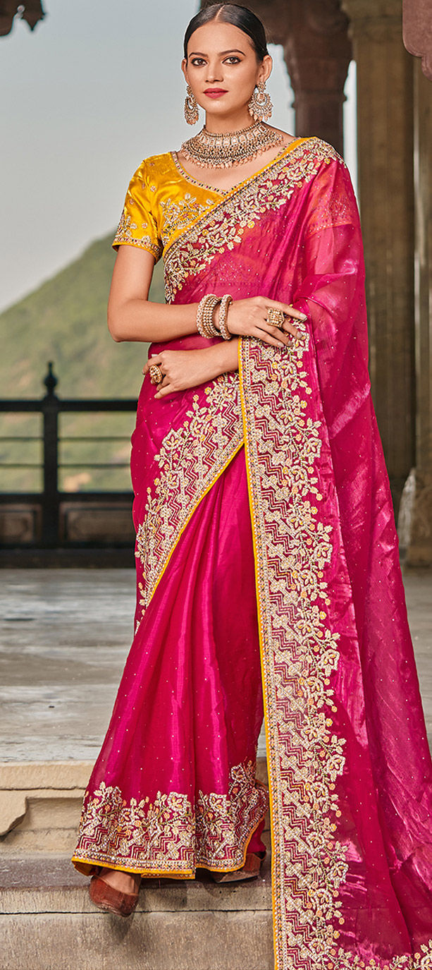 Pink and Majenta color Saree in Satin Silk fabric with Embroidered, Stone, Thread work