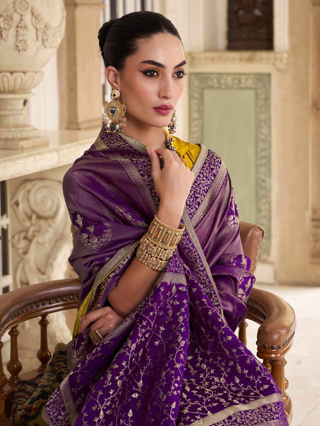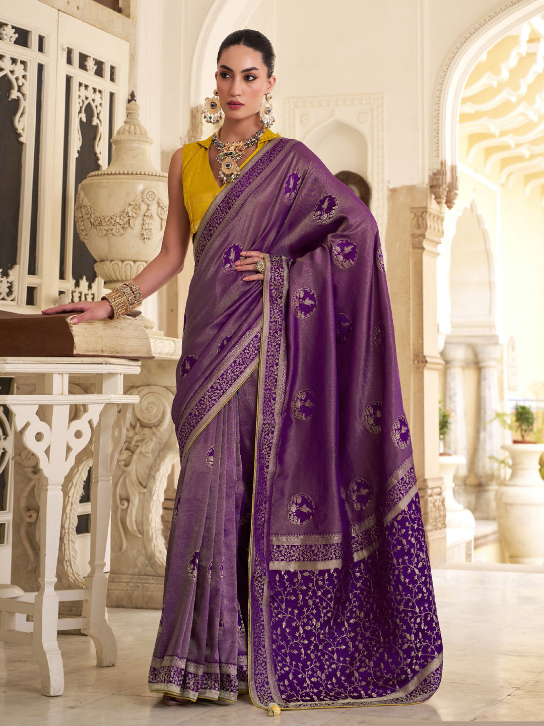 Purple and Violet color Saree in Satin Silk, Tissue fabric with Weaving work