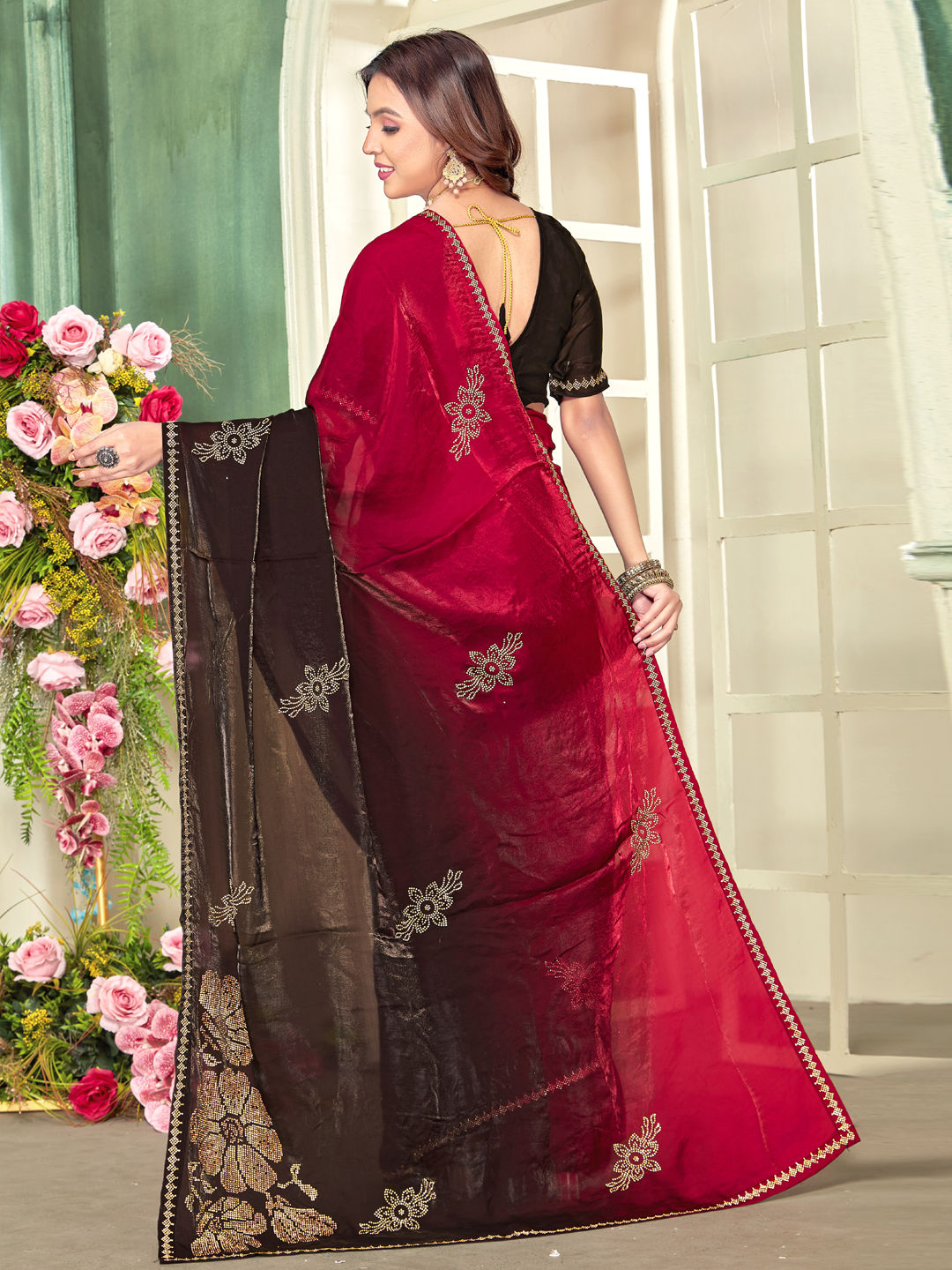 Red and Maroon color Saree in Satin Silk fabric with Thread, Zircon work