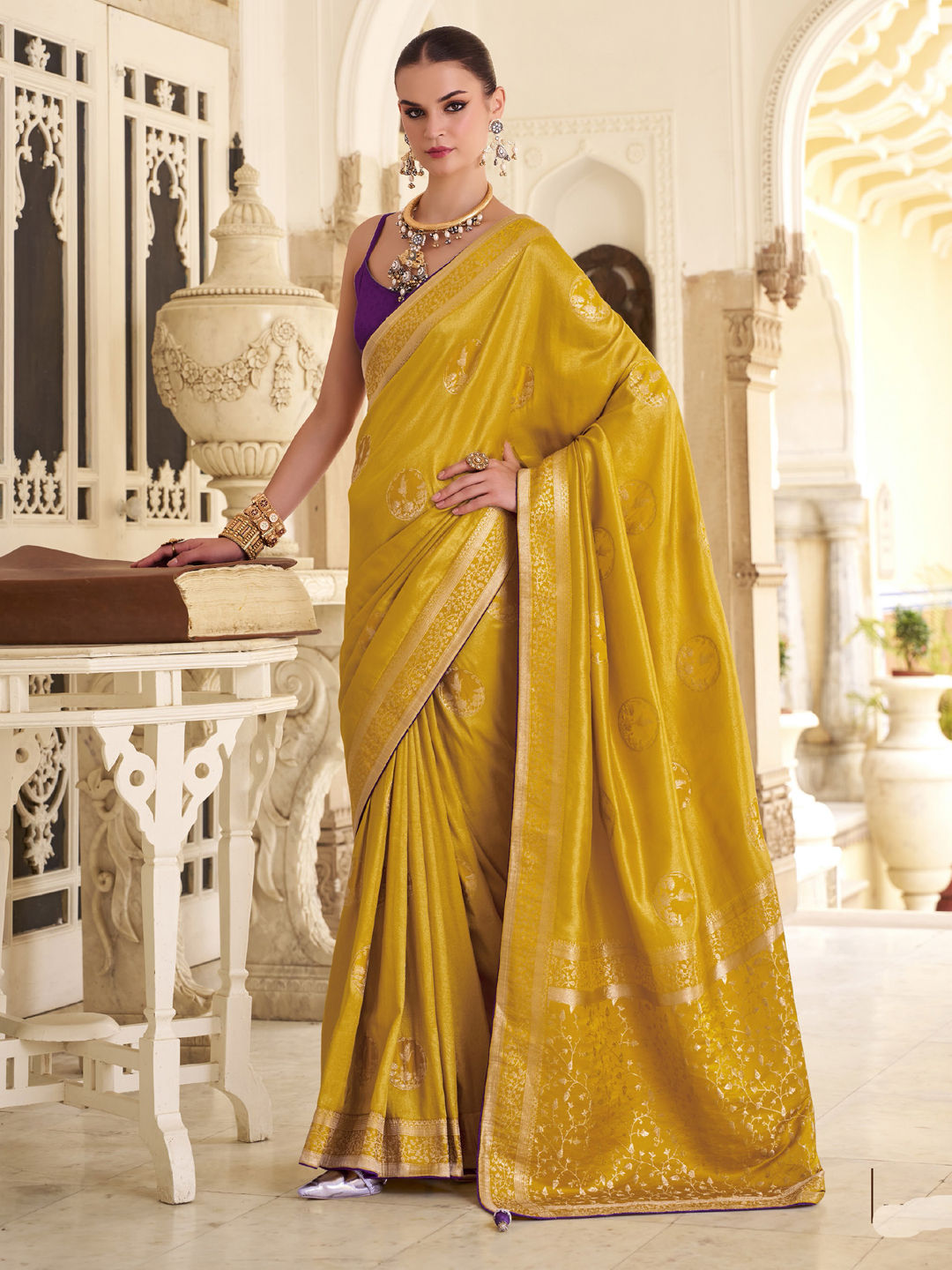 Yellow color Saree in Satin Silk, Tissue fabric with Weaving work