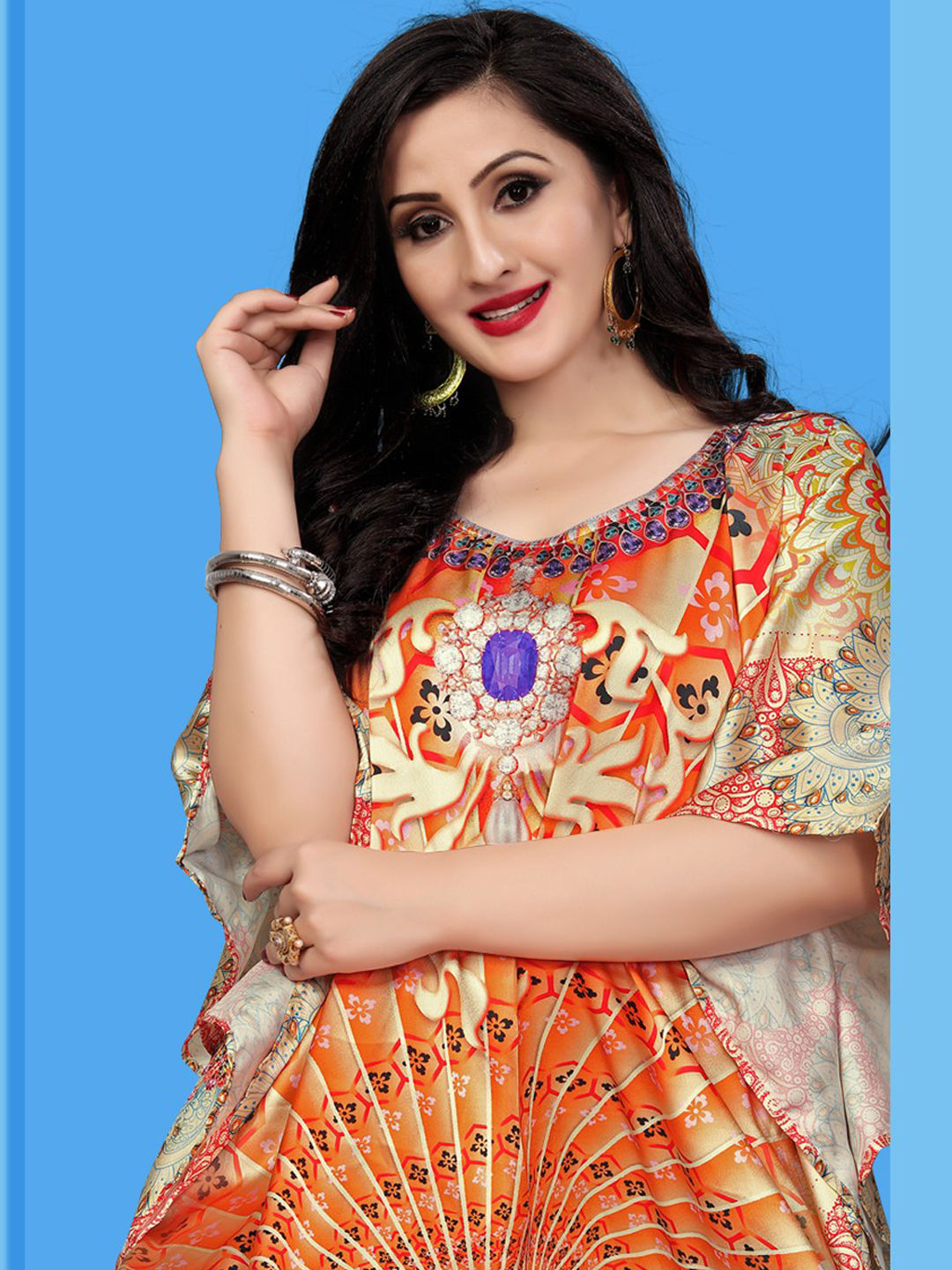 Beige and Brown color Kaftan in Satin Silk fabric with Digital Print, Stone work