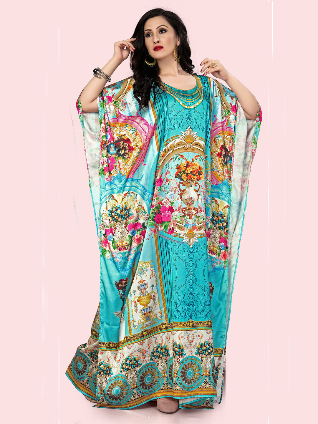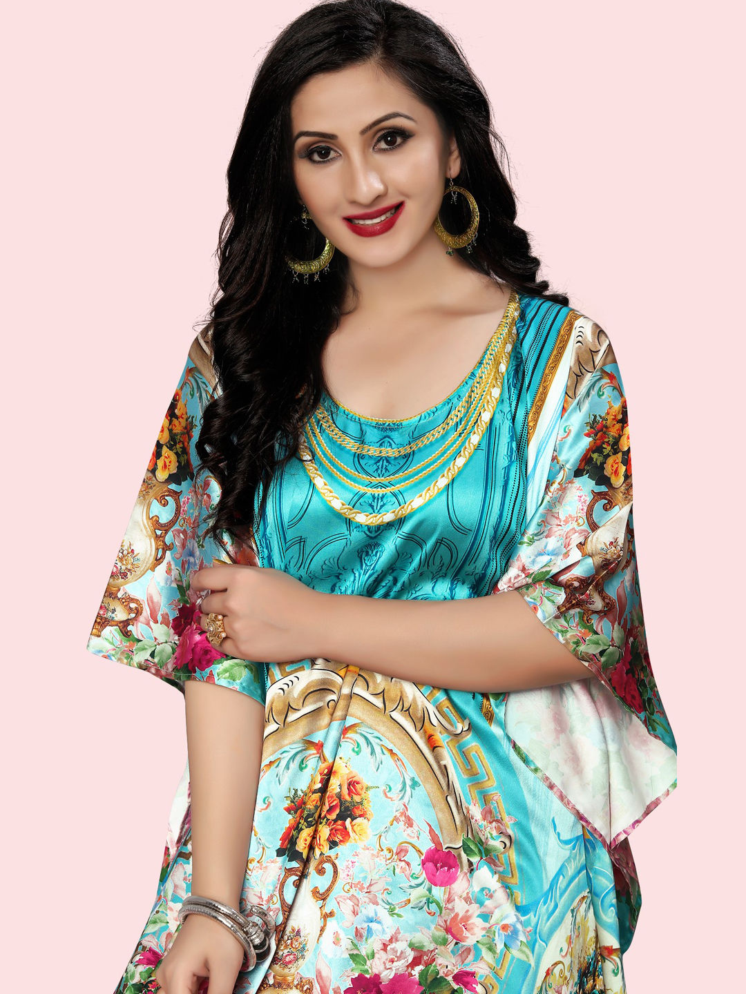 Blue color Kaftan in Satin Silk fabric with Digital Print, Floral, Stone work