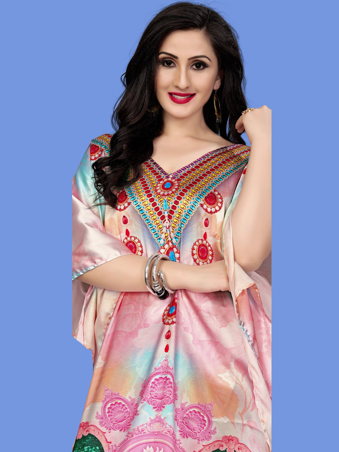 Pink and Majenta color Kaftan in Satin Silk fabric with Digital Print, Floral, Stone work