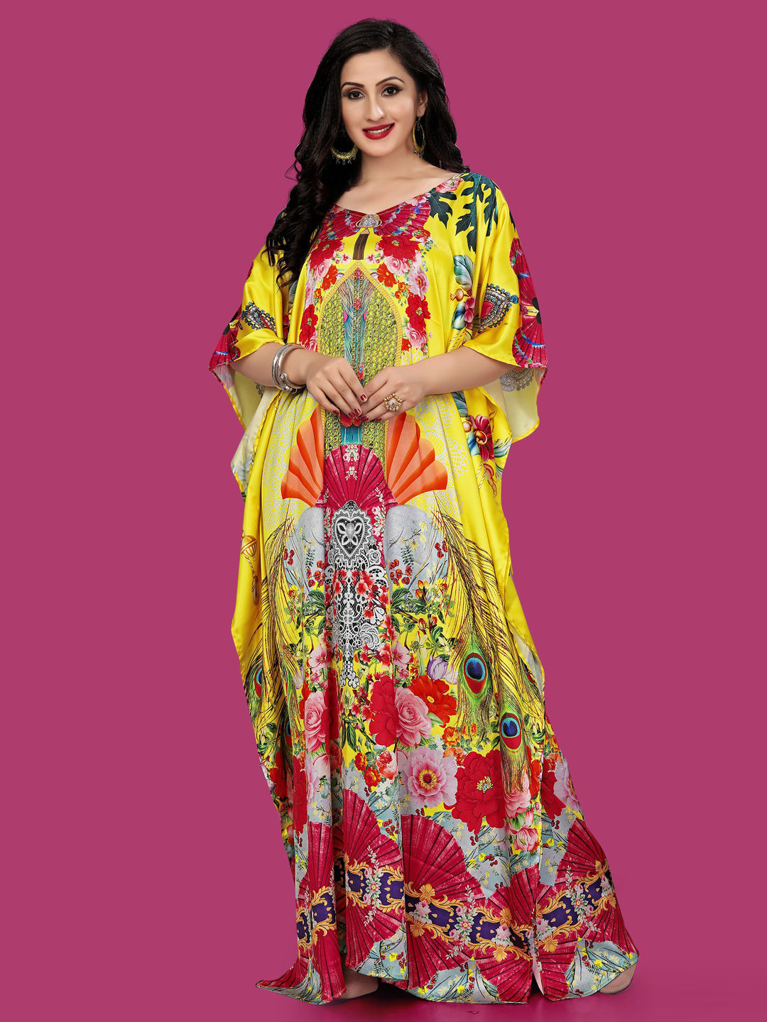 Yellow color Kaftan in Satin Silk fabric with Digital Print, Floral, Stone work