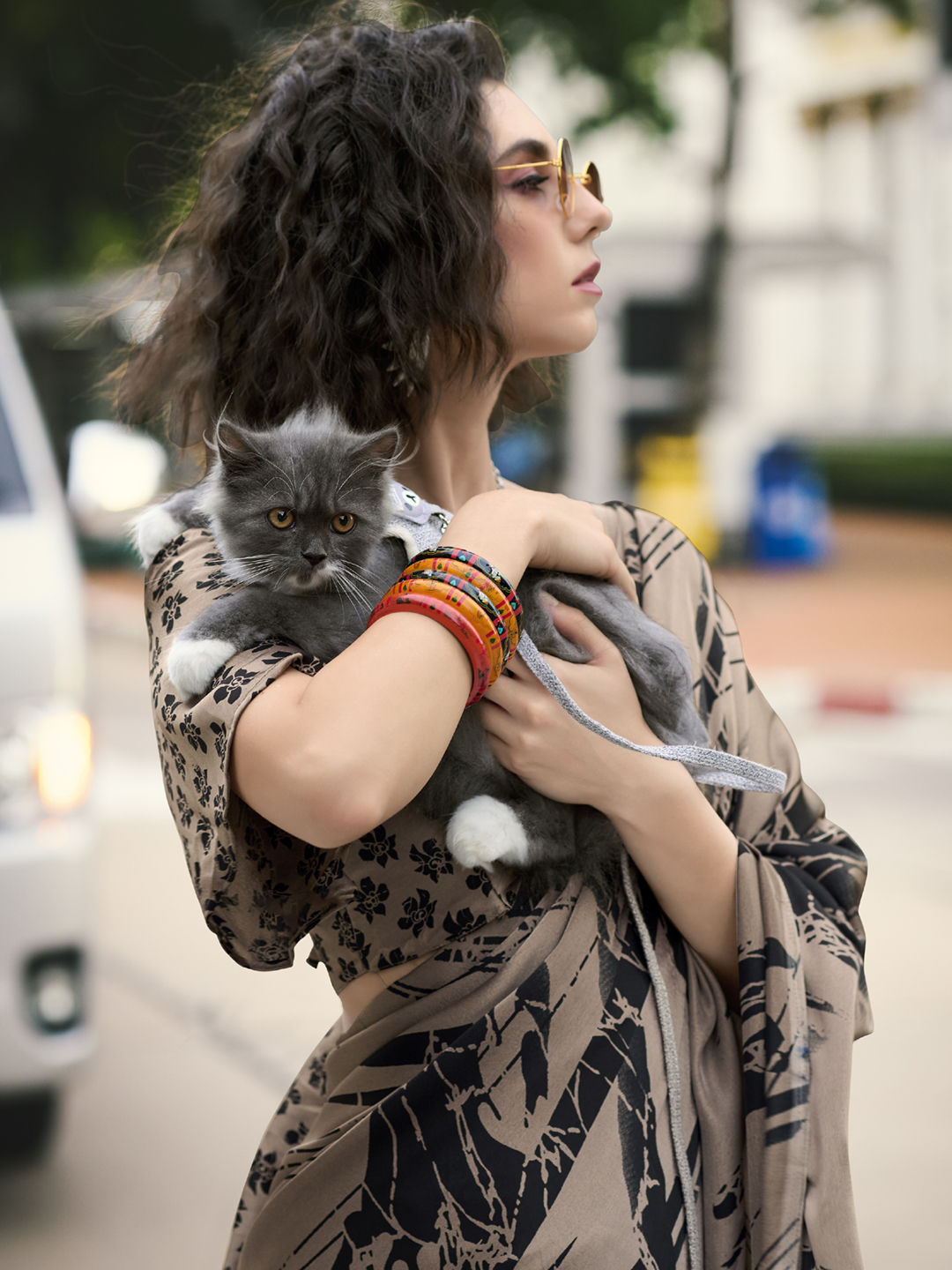 Beige and Brown, Black and Grey color Saree in Satin Silk fabric with Printed work