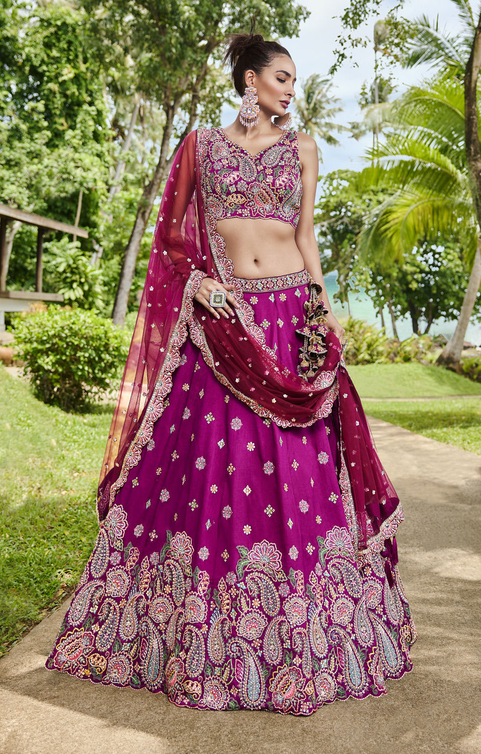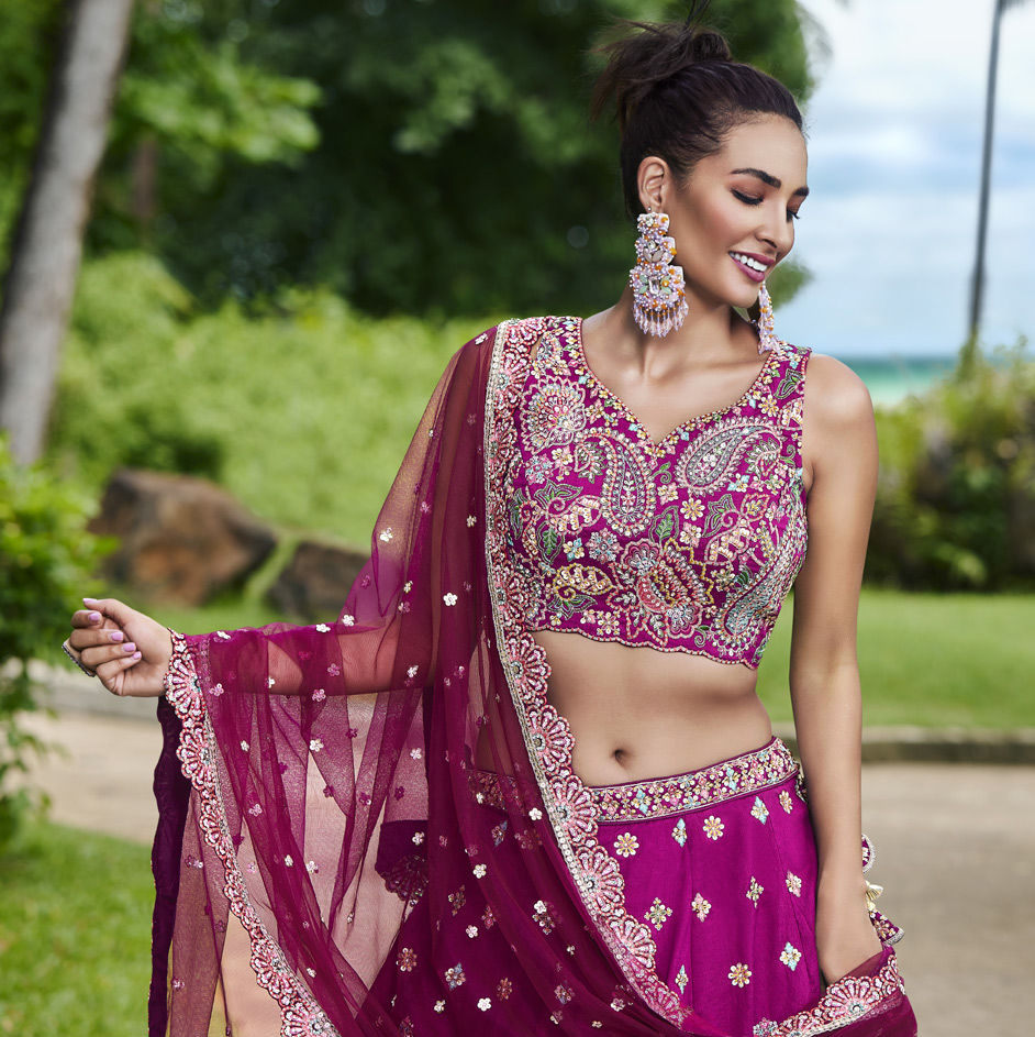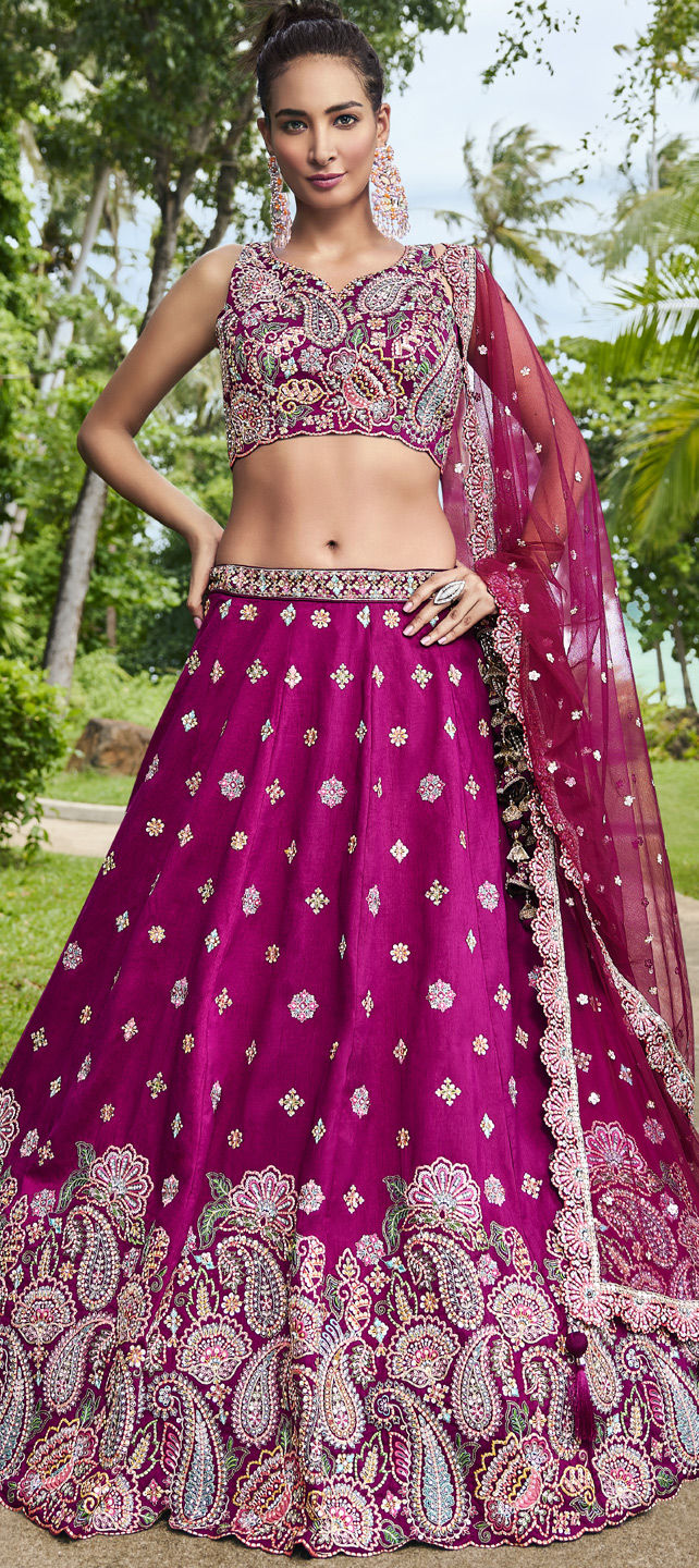 Beige and Brown color Lehenga in Satin Silk fabric with Embroidered, Sequence, Zircon work