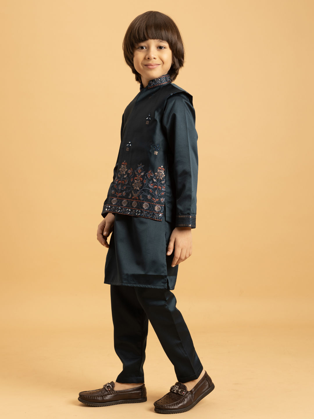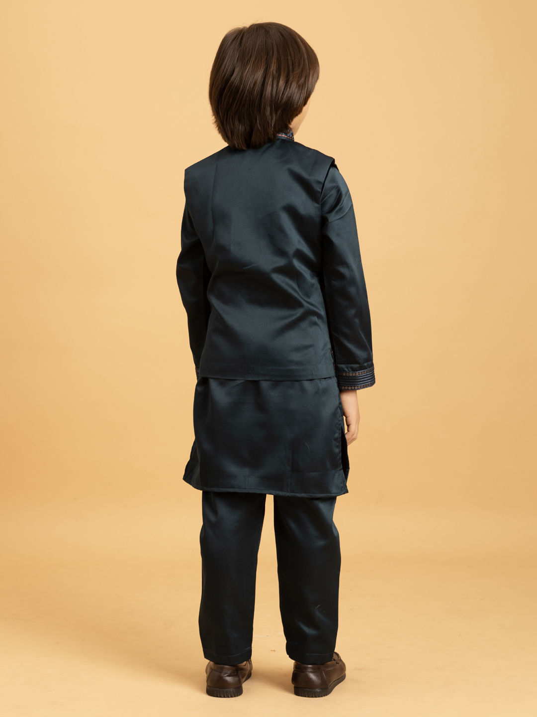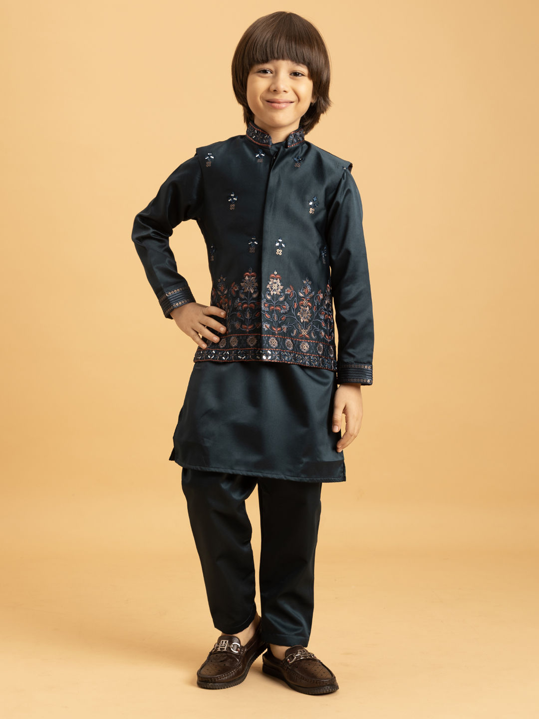 Green color Boys Kurta Pyjama with Jacket in Satin Silk fabric with Embroidered, Mirror, Sequence work