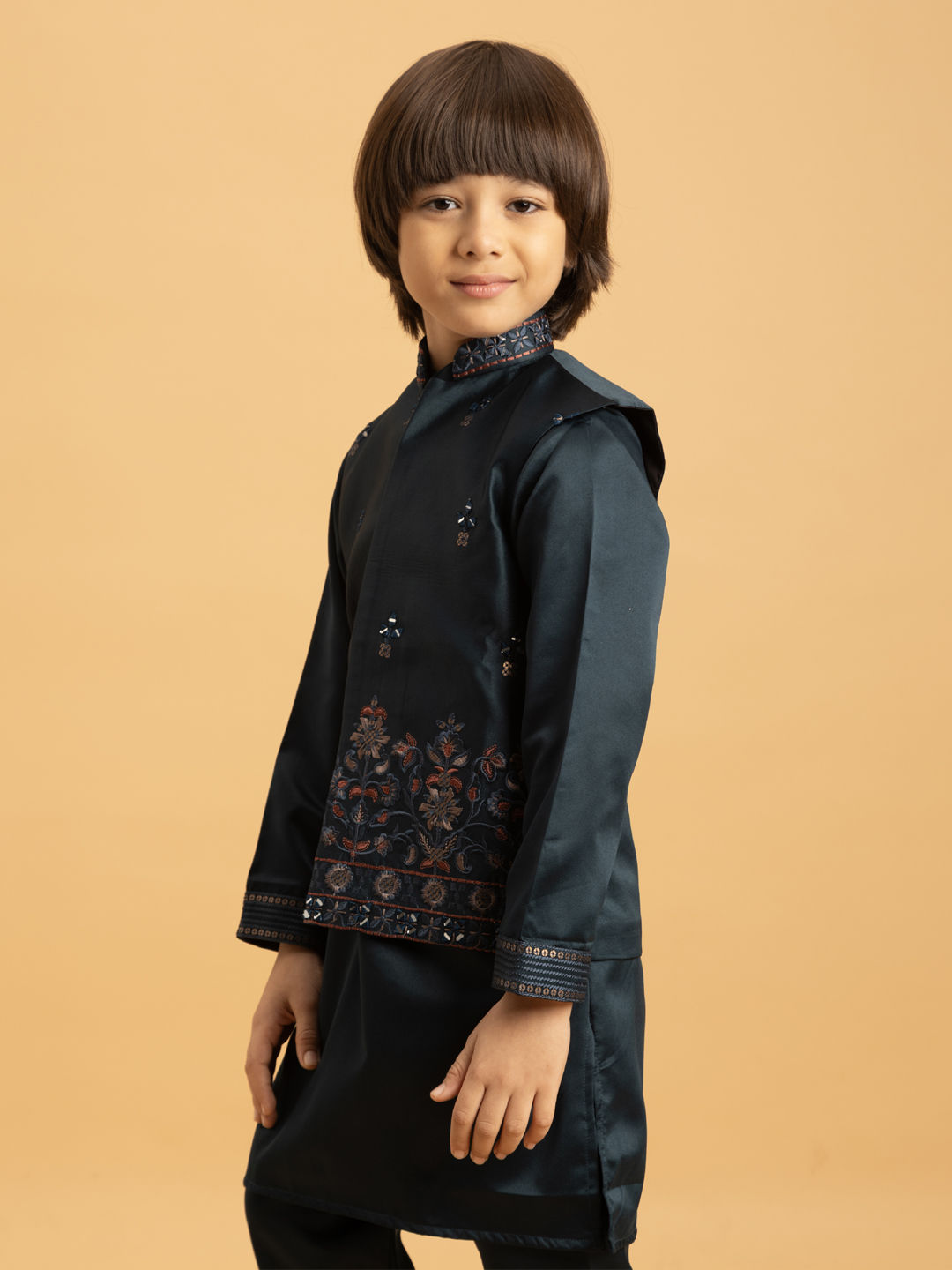 Satin Silk Wedding Boys Kurta Pyjama with Jacket in Black and Grey with Mirror work