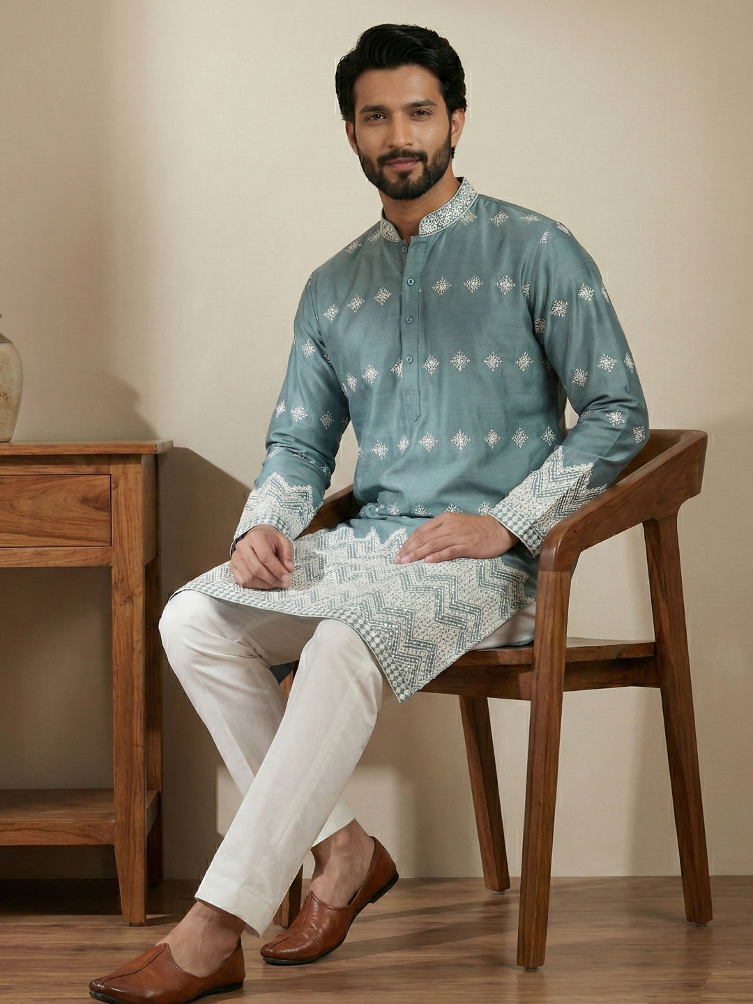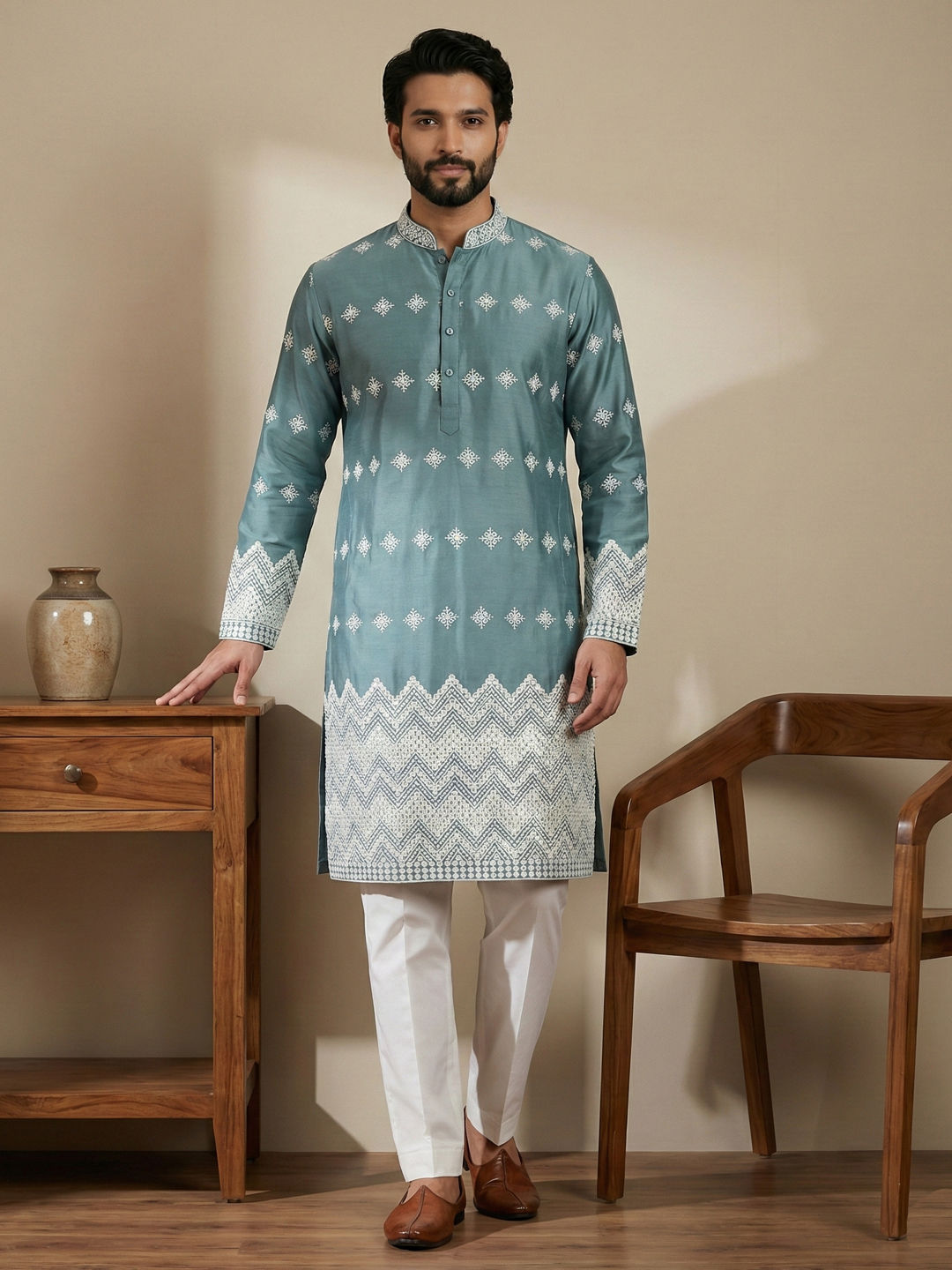 Satin Silk Festive Kurta Pyjamas in Blue with Embroidered work