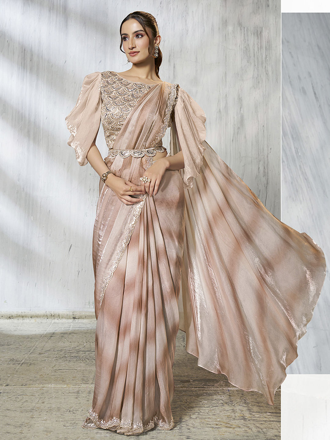 Beige and Brown color Readymade Saree in Satin Silk fabric with Bugle Beads, Embroidered, Lehariya, Printed work