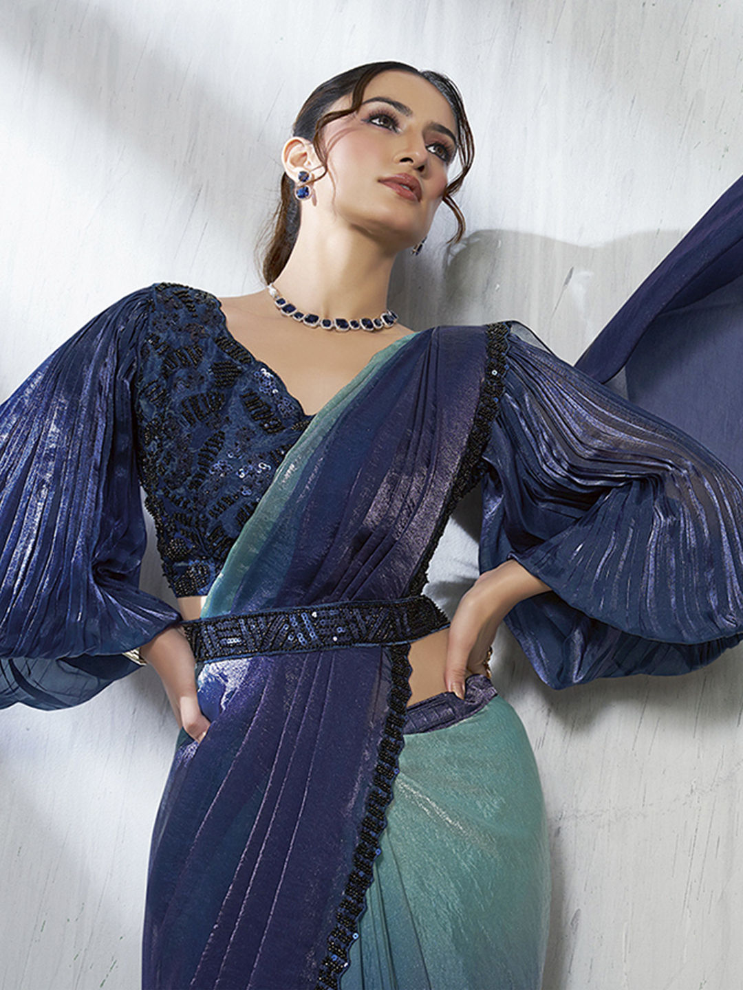 Blue color Readymade Saree in Satin Silk fabric with Bugle Beads, Embroidered, Printed, Sequence work
