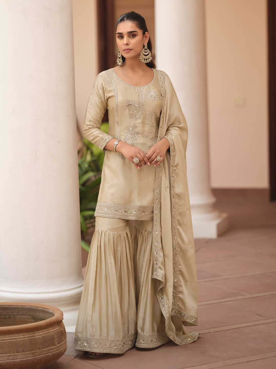 Beige and Brown color Salwar Kameez in Satin Silk fabric with Embroidered work
