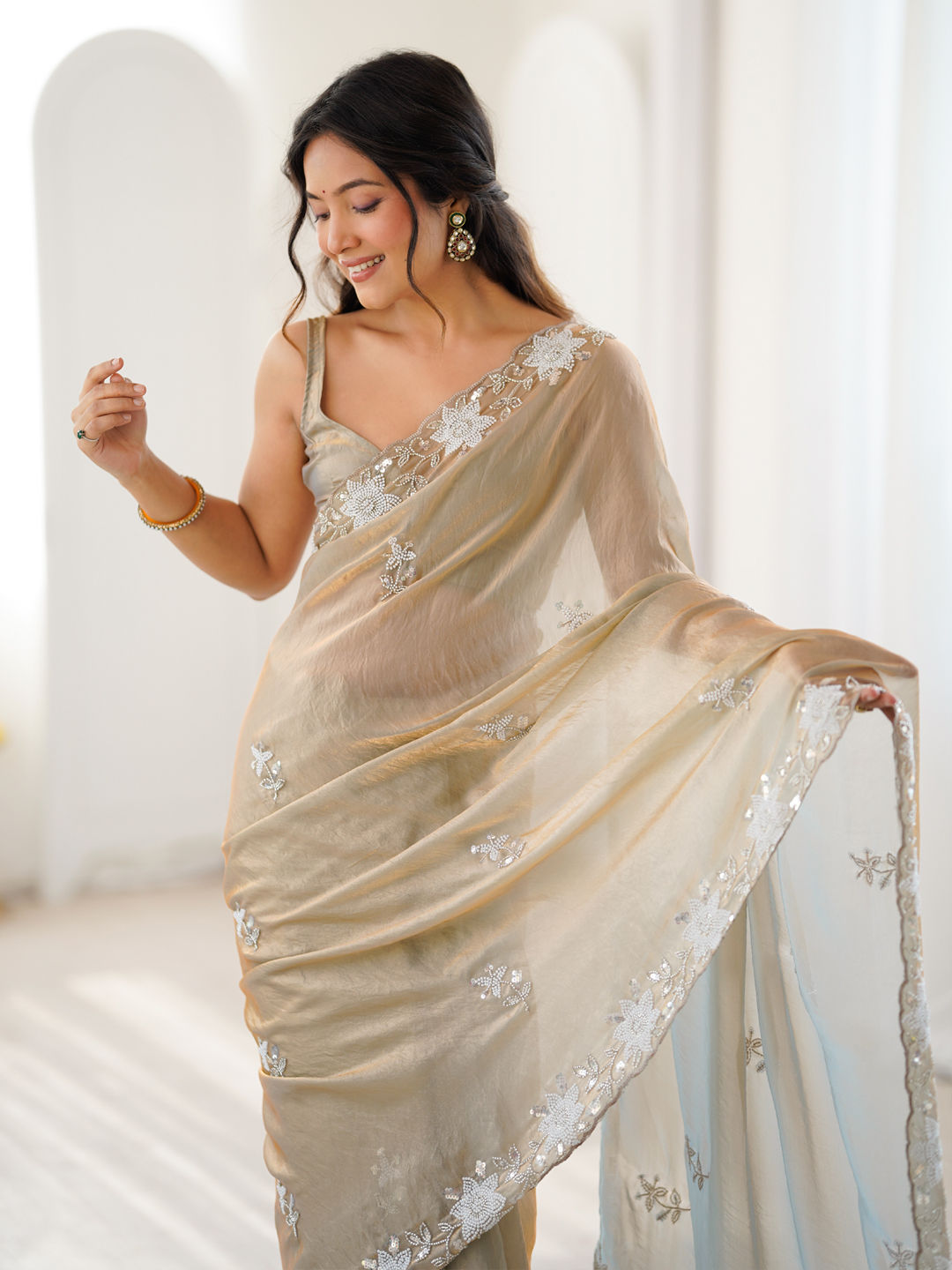 Beige and Brown color Saree in Satin Silk fabric with Cut Dana, Moti, Sequence work