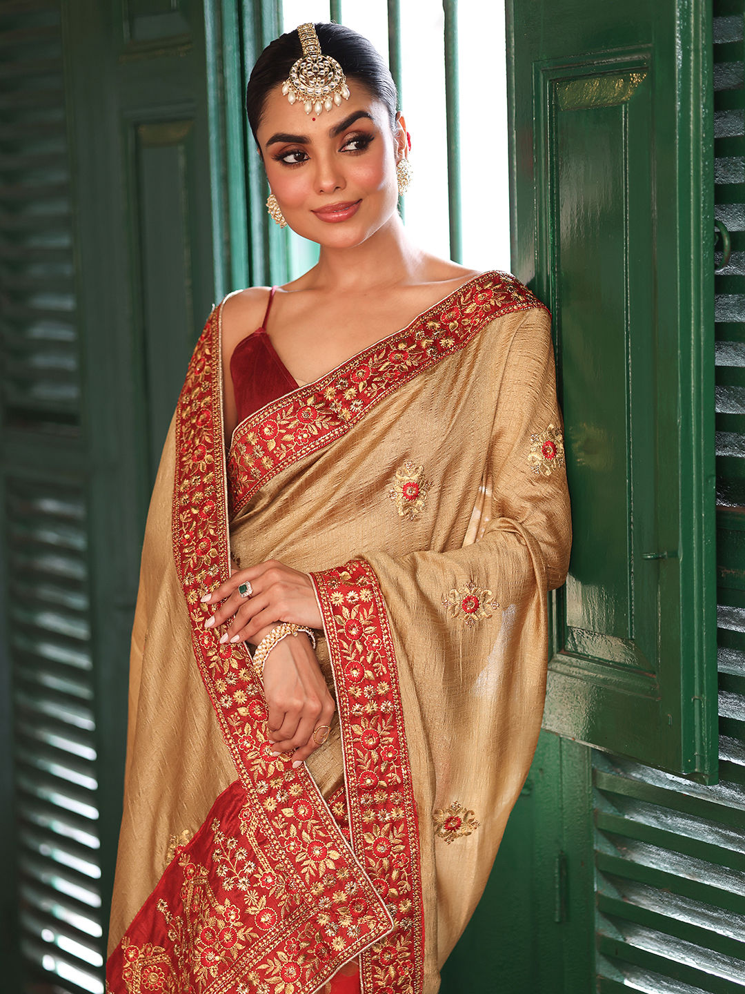 Beige and Brown, Red and Maroon color Saree in Satin Silk fabric with Embroidered, Sequence, Thread work
