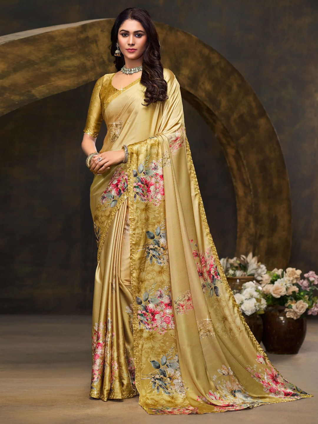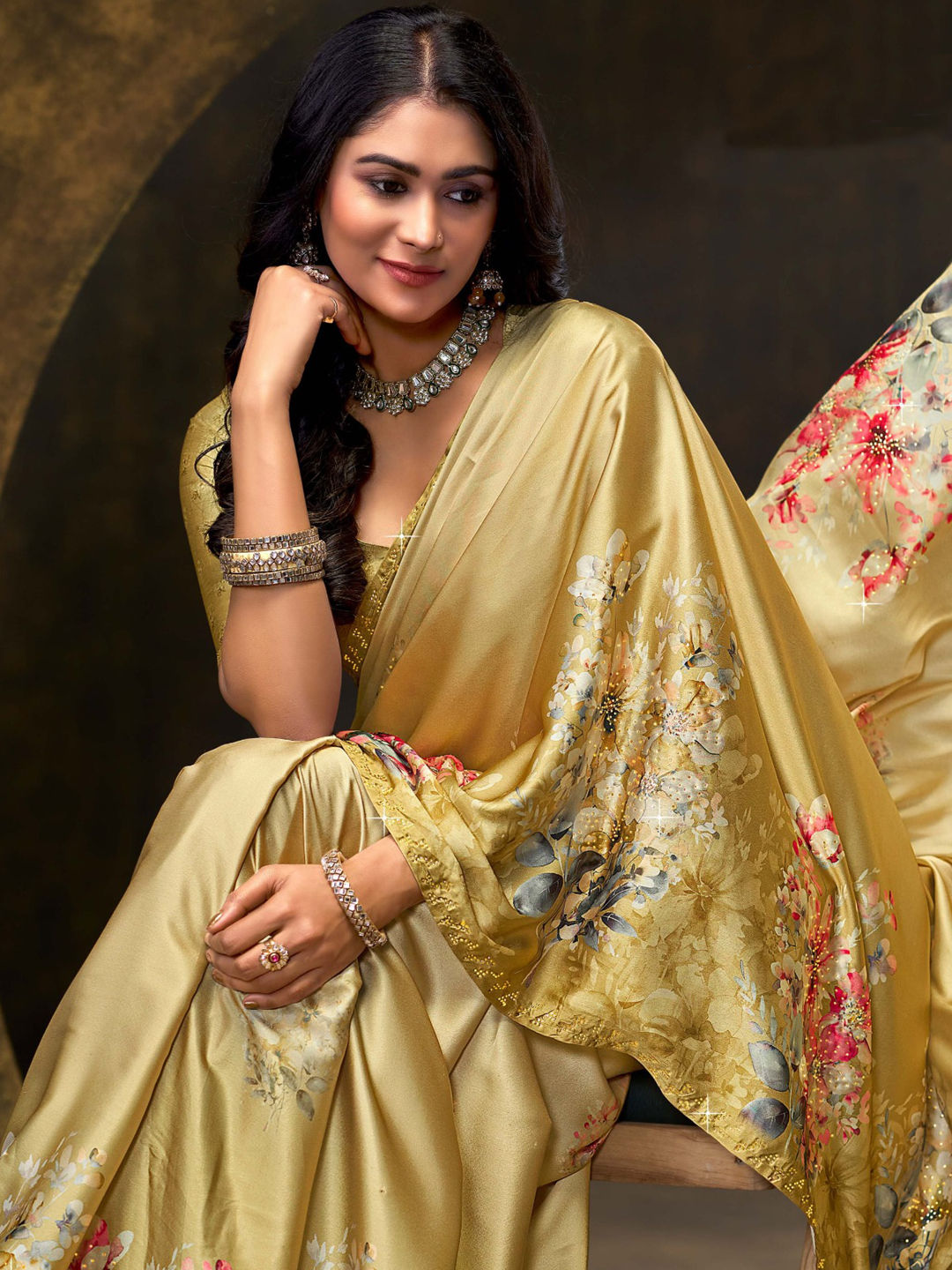 Beige and Brown color Saree in Satin Silk fabric with Floral, Printed work