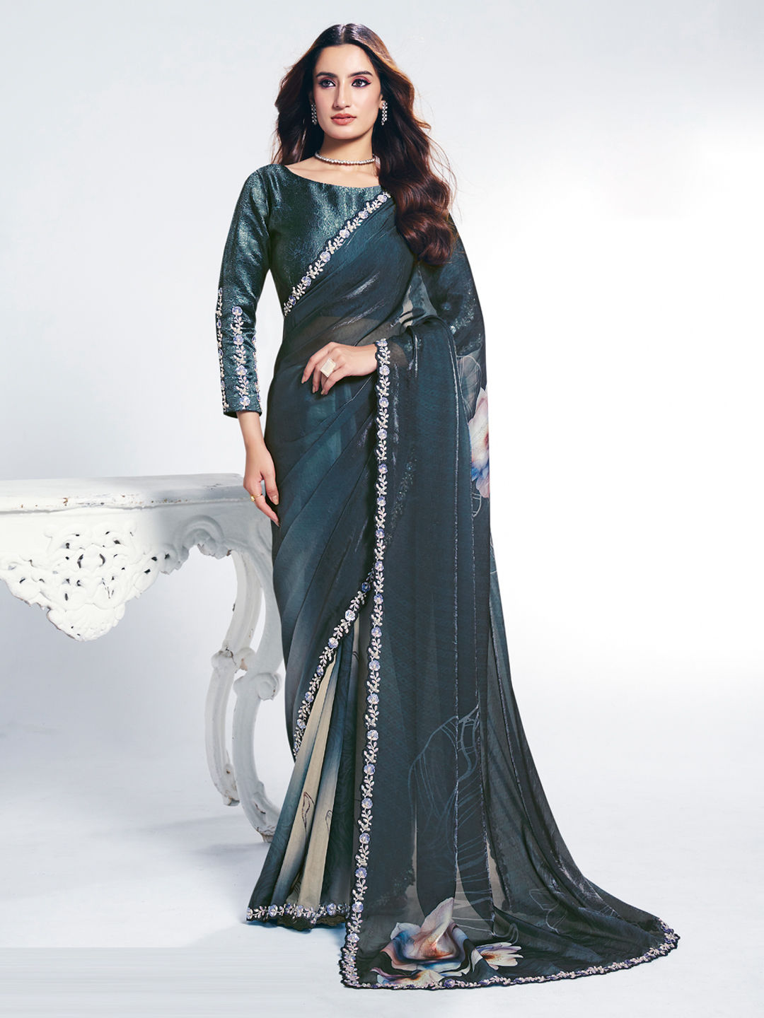 Black and Grey color Saree in Satin Silk fabric with Digital Print, Embroidered, Stone work