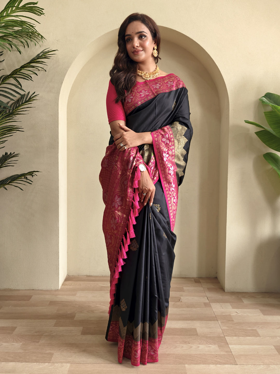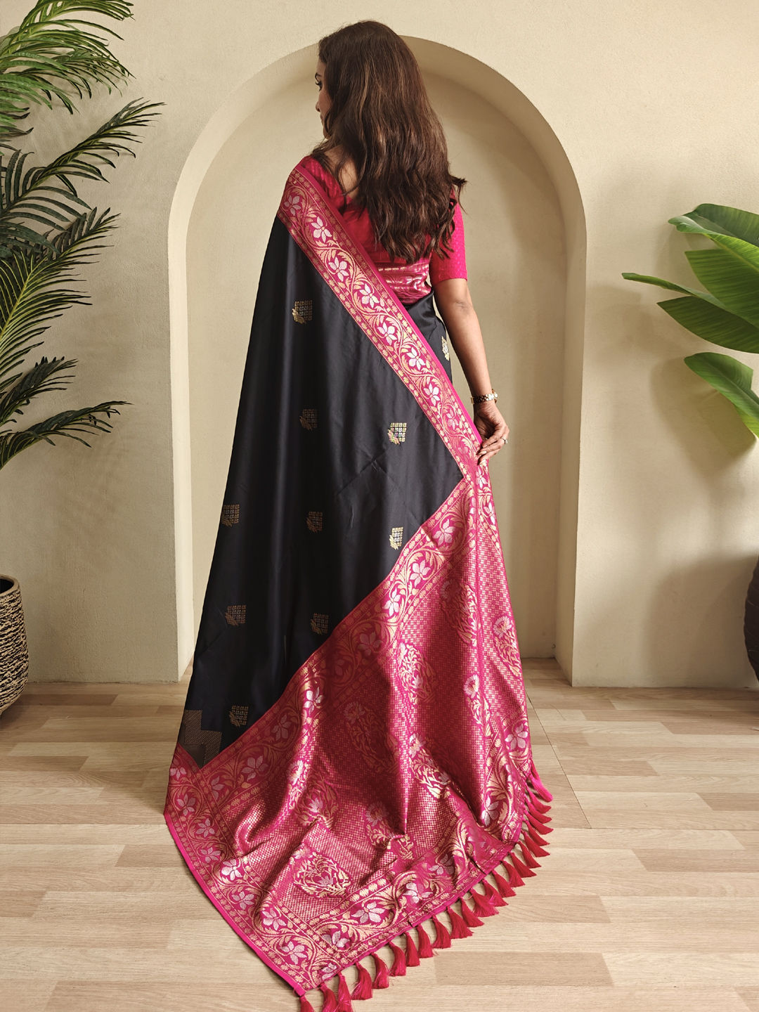 Satin Silk Festive Saree in Pink and Majenta with Weaving work