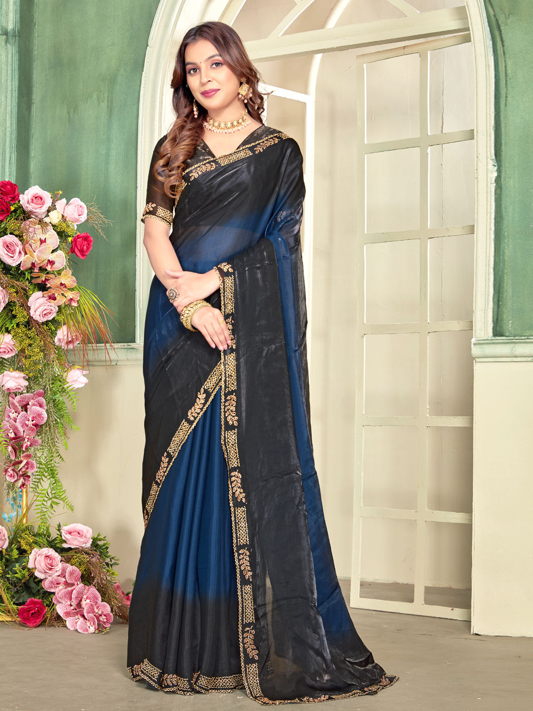 Blue color Saree in Satin Silk fabric with Zircon work