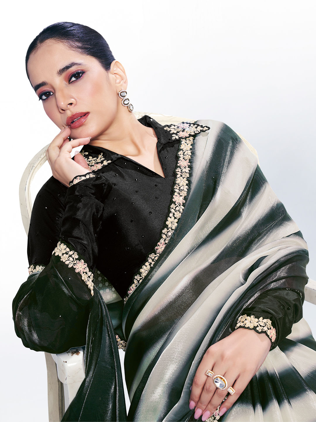Green, White and Off White color Saree in Satin Silk fabric with Digital Print, Embroidered, Stone work