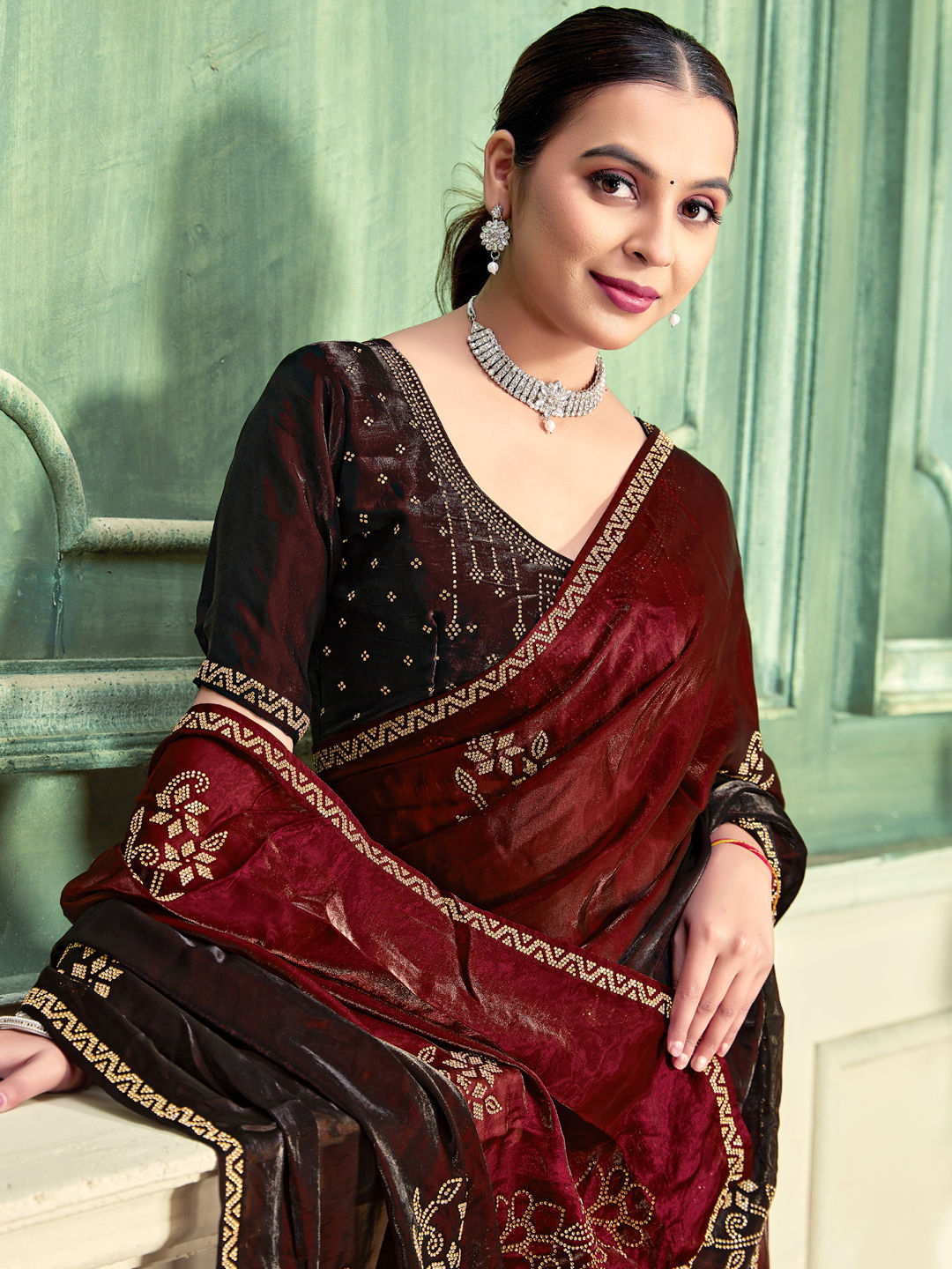 Red and Maroon color Saree in Satin Silk fabric with Zircon work