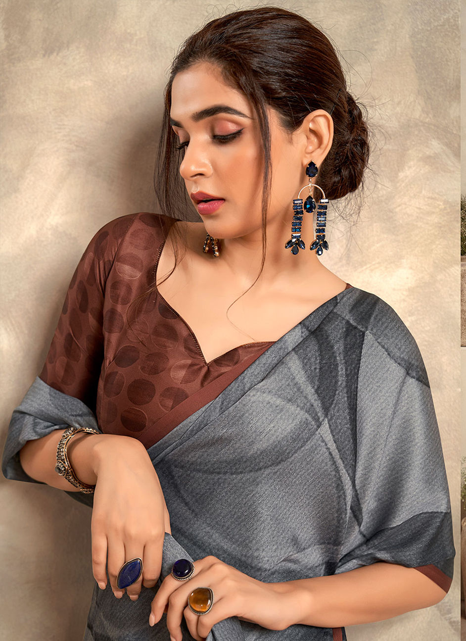 Black and Grey color Saree in Satin Silk fabric with Printed work
