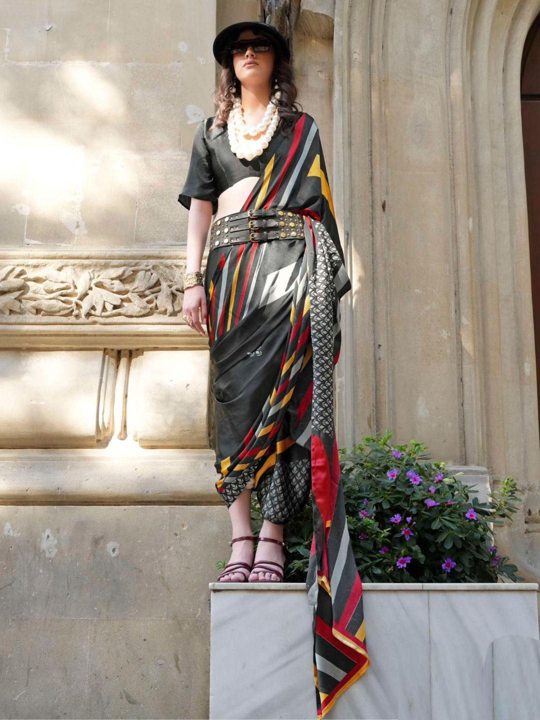 Black and Grey color Saree in Satin Silk fabric with Printed work
