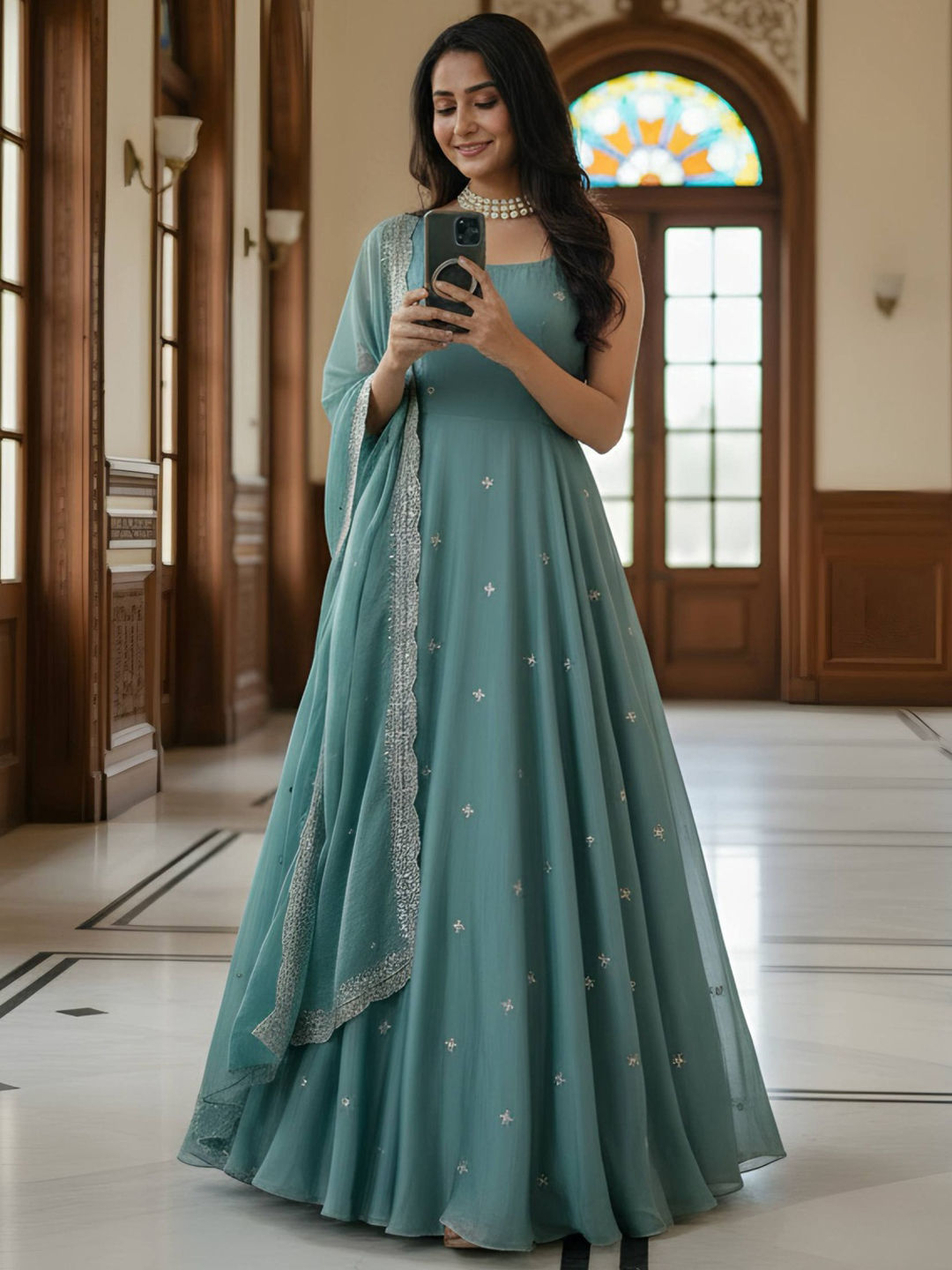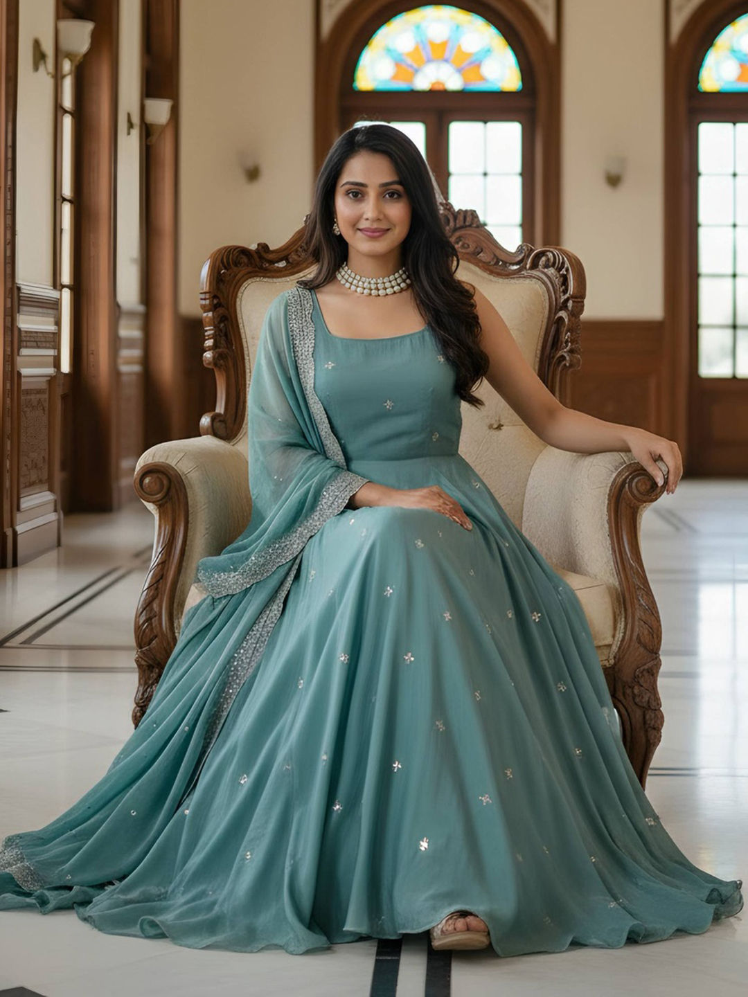 Blue color Gown in Satin Silk fabric with Embroidered, Sequence, Zari work