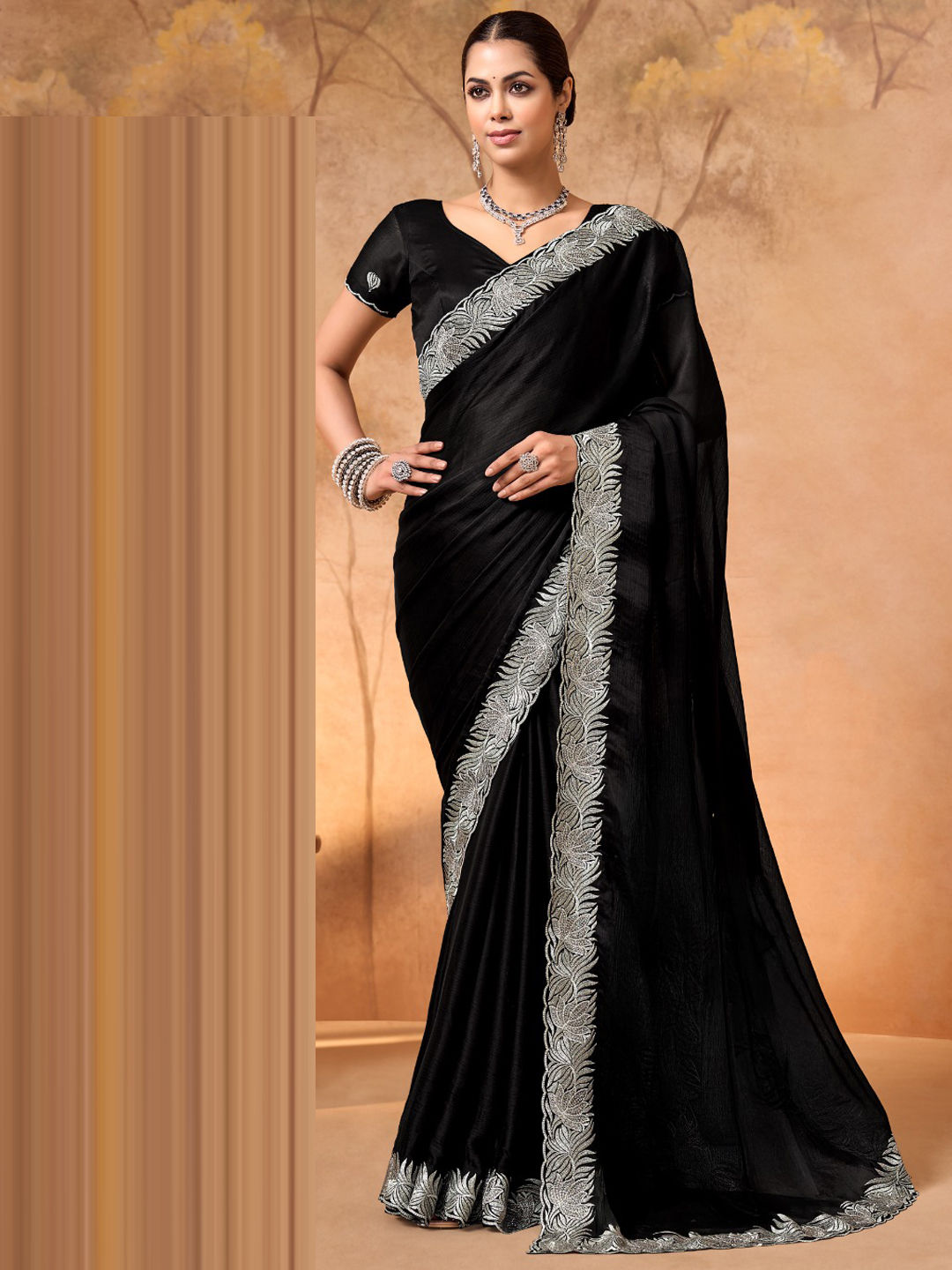 Black and Grey color Saree in Chiffon, Satin Silk fabric with Embroidered, Thread work