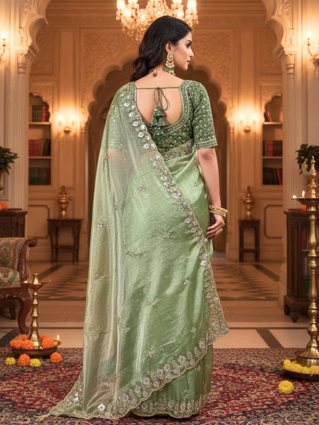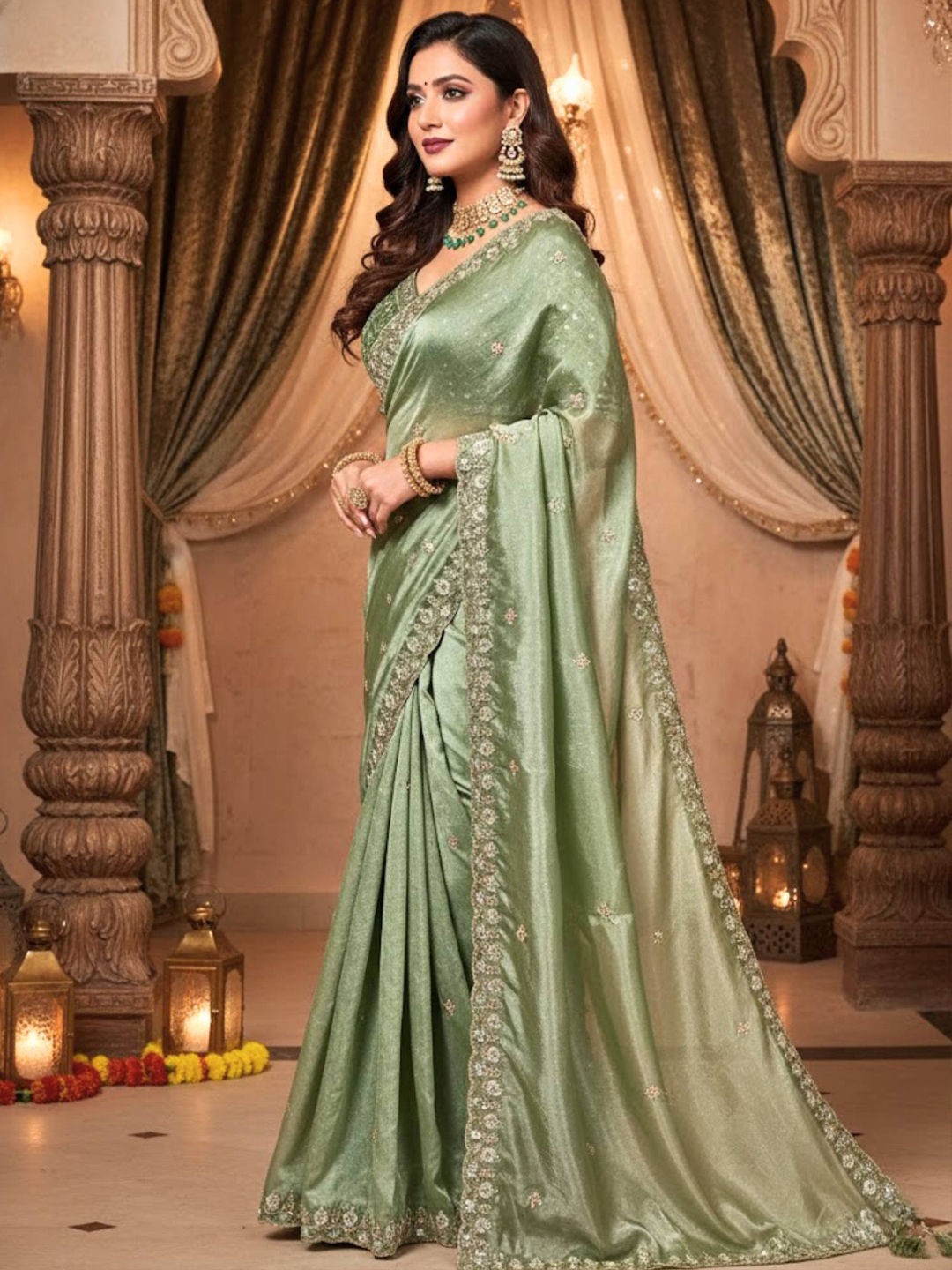 Green color Saree in Satin Silk fabric with Embroidered, Sequence, Thread work