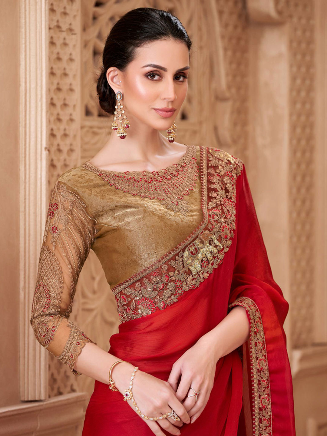 Red and Maroon color Saree in Satin Silk fabric with Embroidered, Sequence work