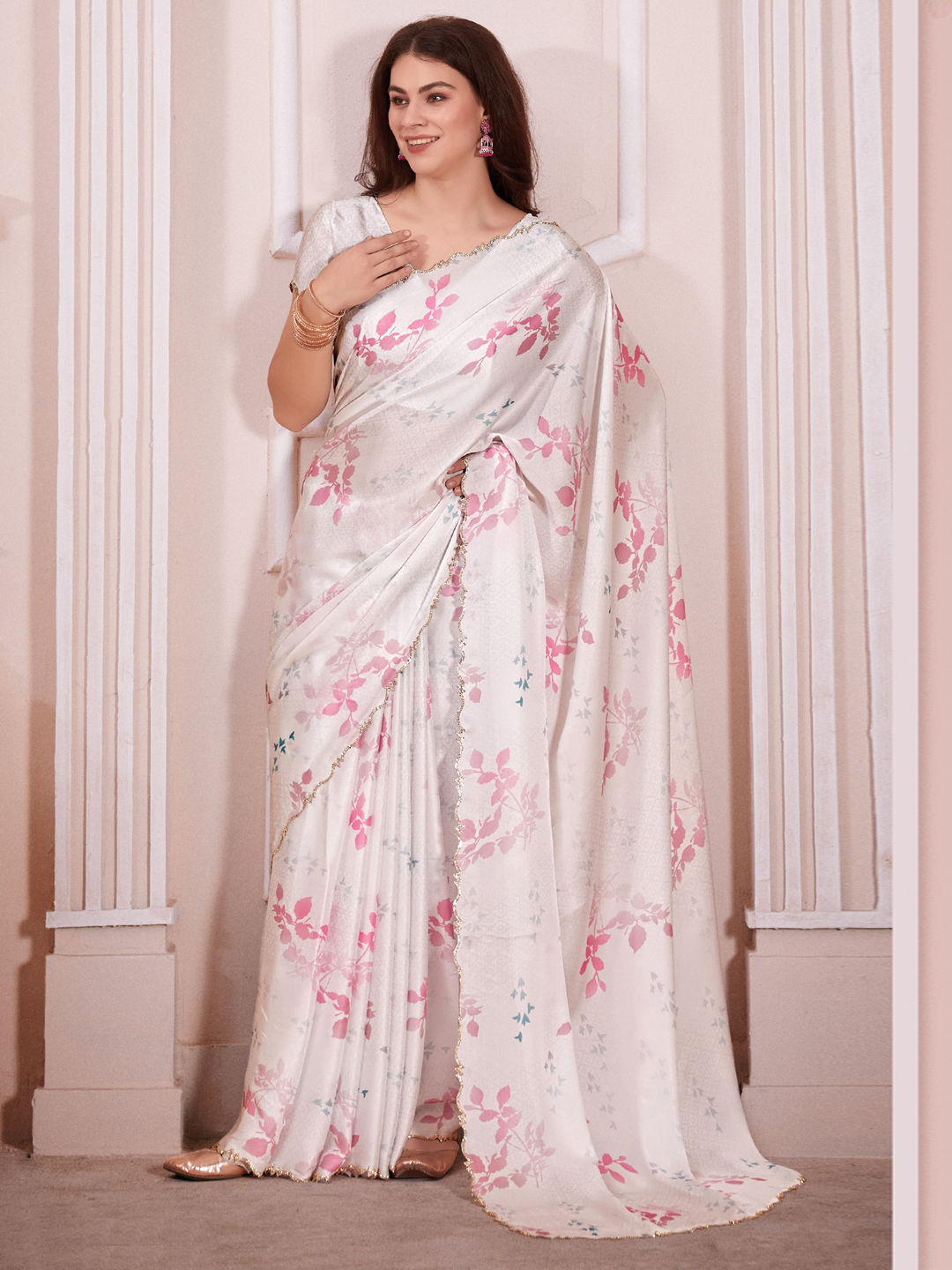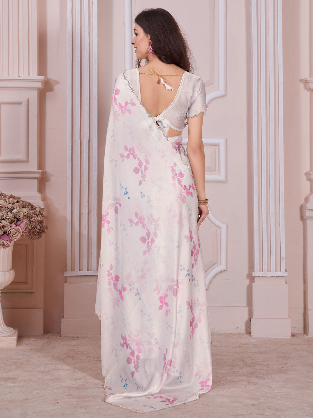White and Off White color Saree in Satin Silk fabric with Digital Print, Floral, Printed, Zircon work