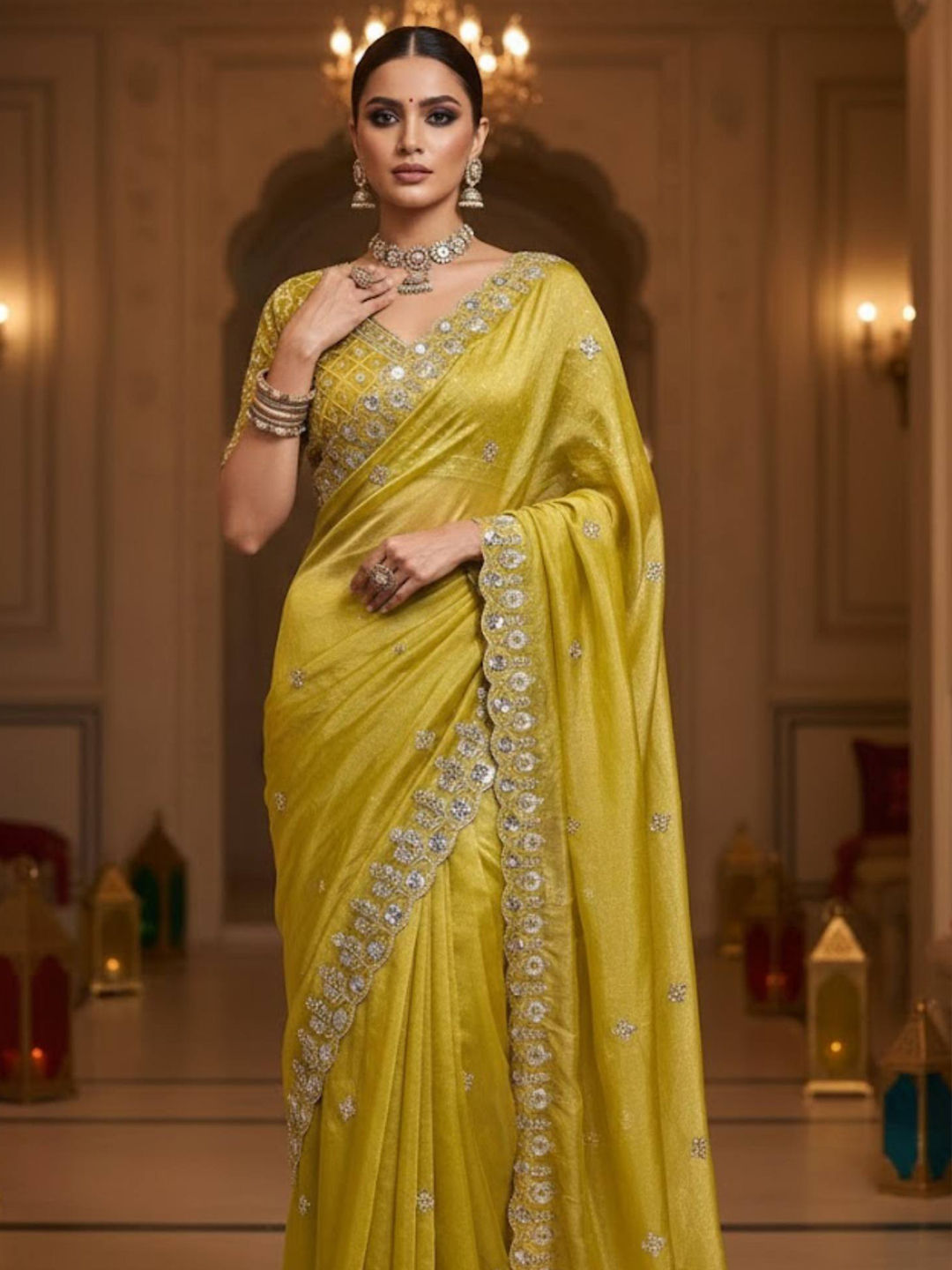 Yellow color Saree in Satin Silk fabric with Embroidered, Sequence, Thread work