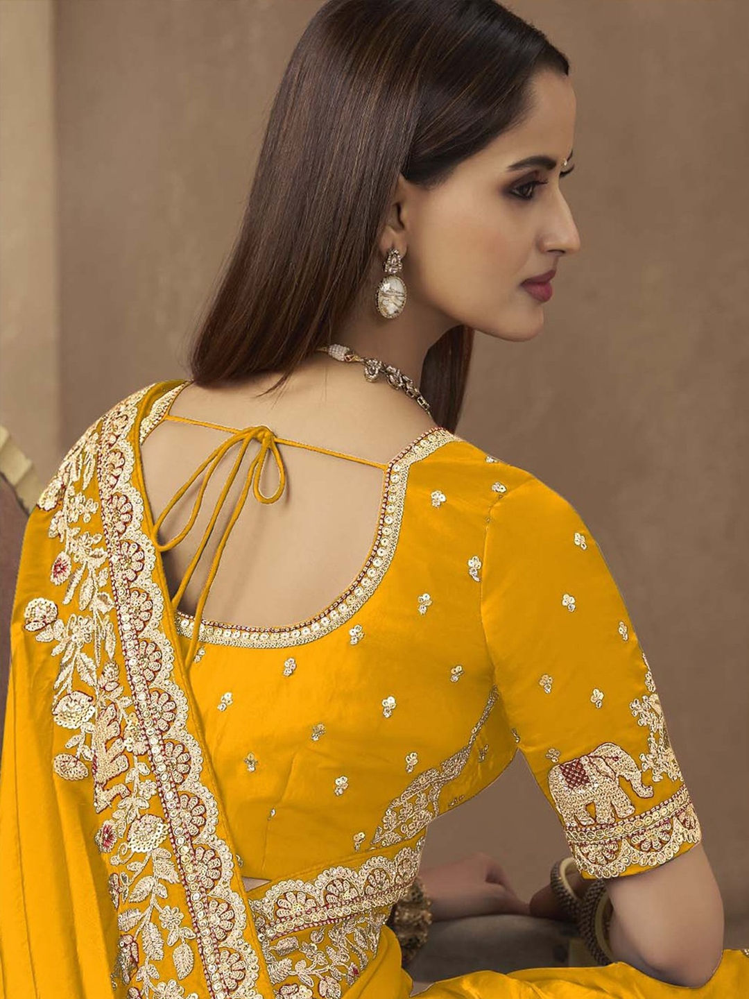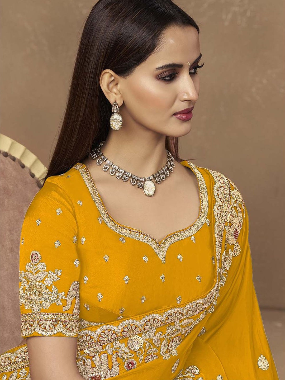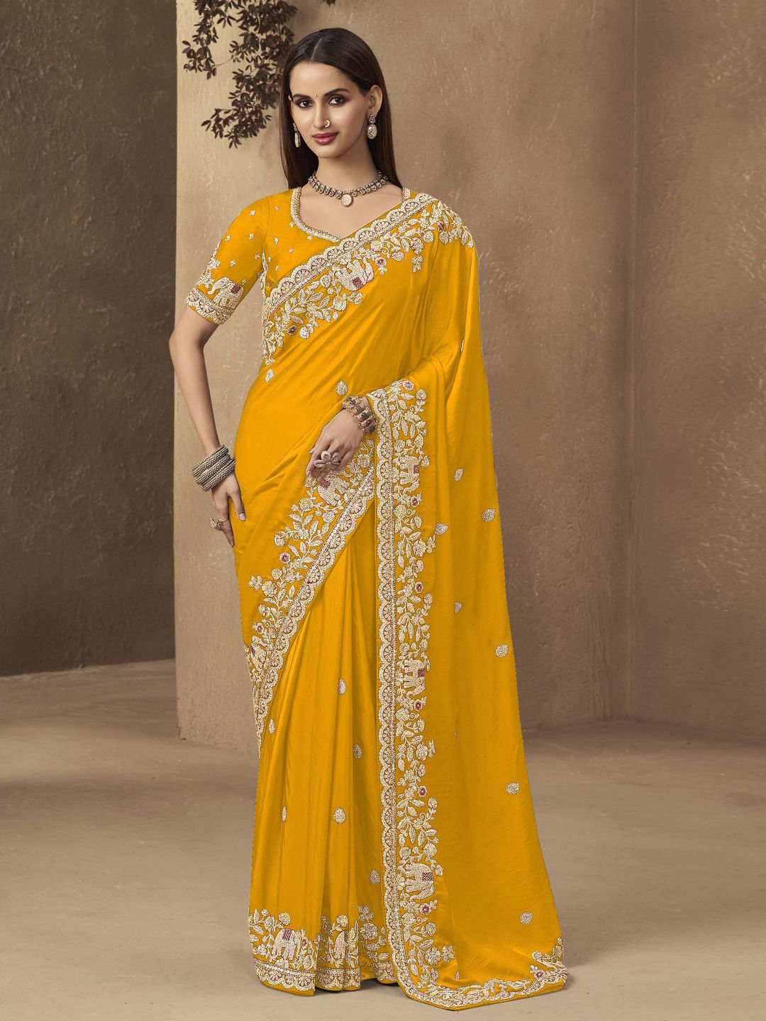 Yellow color Saree in Satin Silk fabric with Embroidered, Sequence, Thread, Zari work